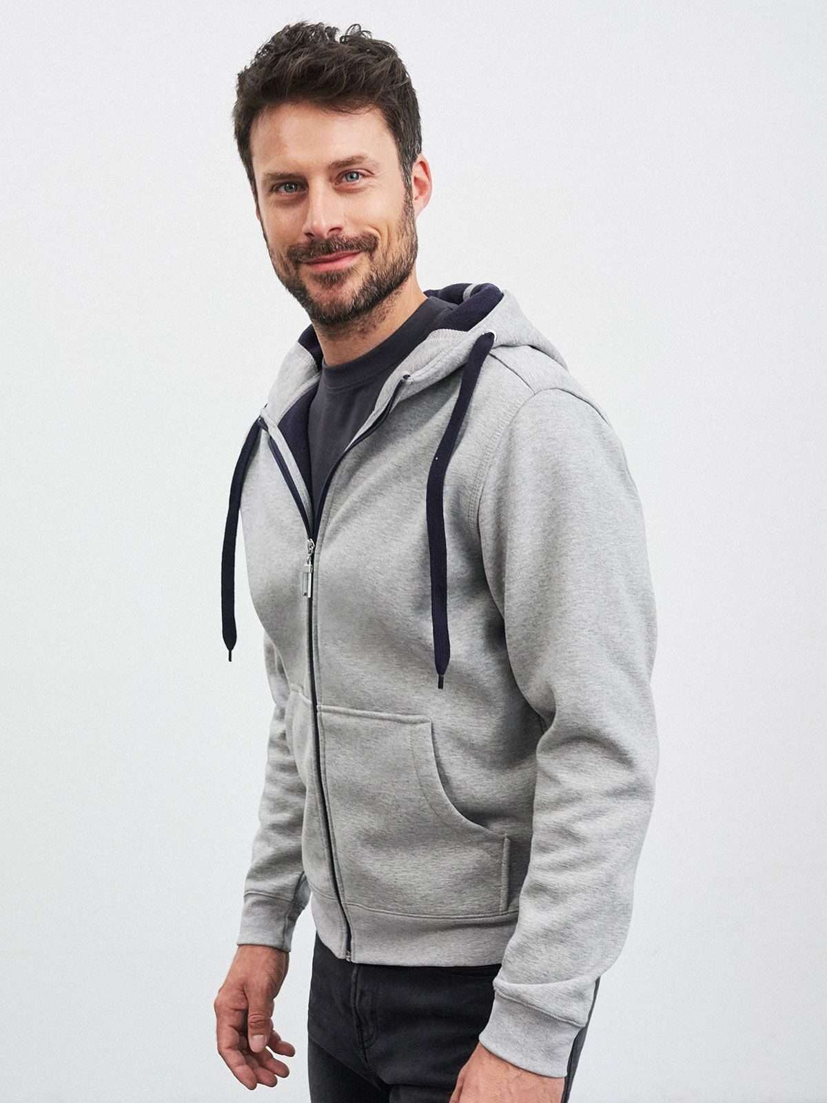 55% poliestere, 45% cotone. Felpa sportiva con maniche set-in. Zip intera, parte interna del cappuccio, parte interna della felpa e cordoncini di colore contrastante, felpata internamente, orlo inferiore e polsini in elastane, tasca a marsupio, struttura con cuciture laterali.