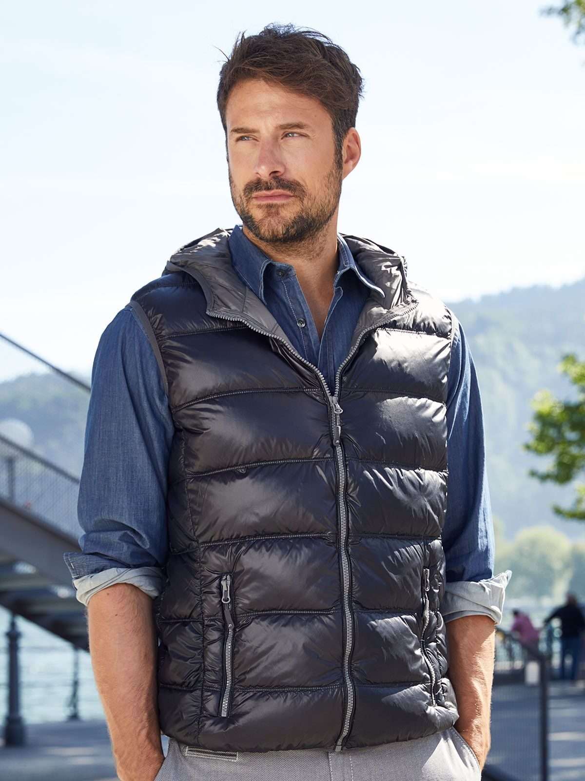 100% poliammide. Materiale esterno e fodera: 100% poliammide. Imbottitura: 90% piuma, 10% penna. Piumino smanicato ultraleggero reversibile, con cappuccio in stile casual. Soffice, leggero, tessuto antivento, impermeabile, doppie cuciture, due tasche laterali con cerniere e due tasche interne.