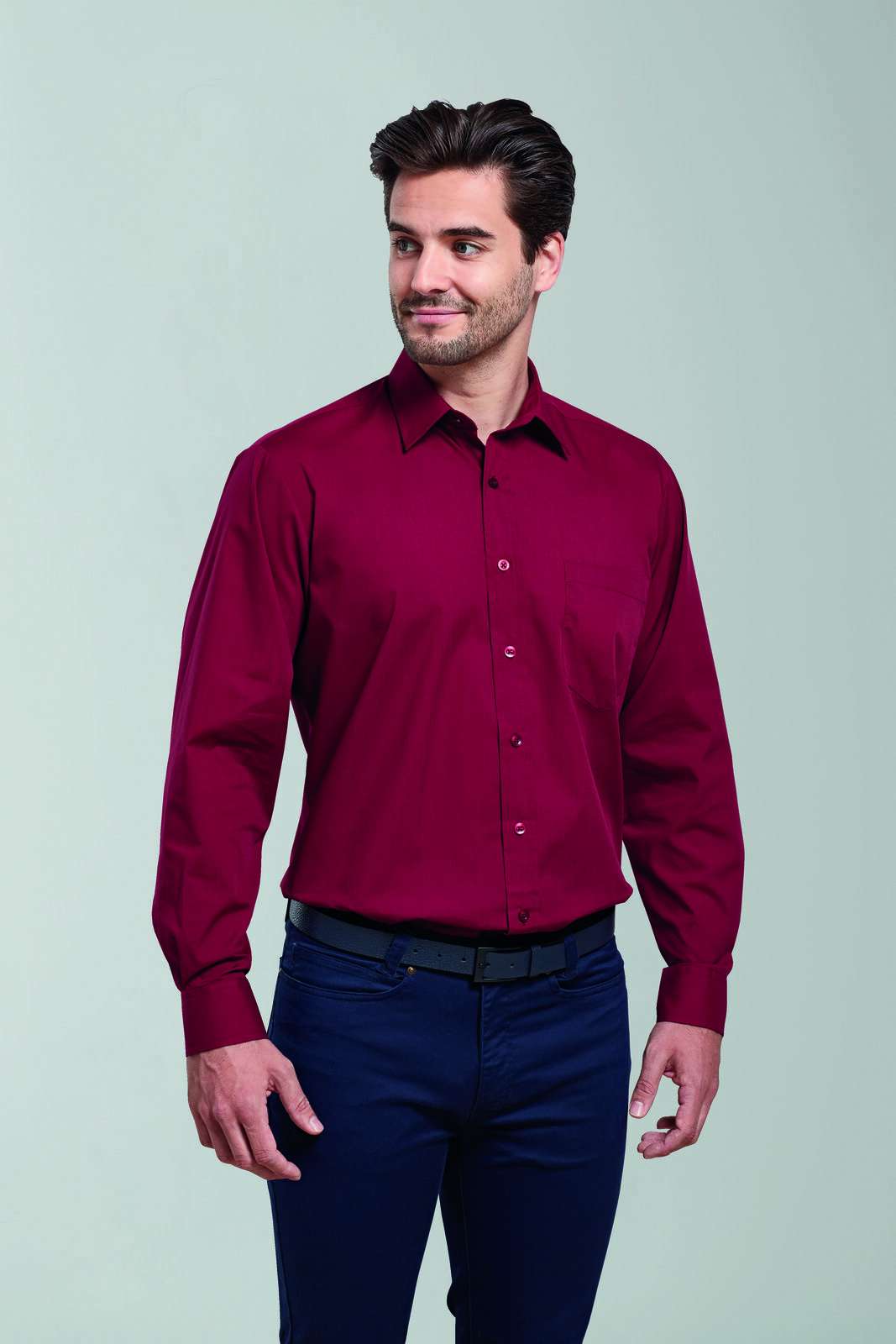 65% poliestere, 35% cotone. Camicia a maniche lunghe in popeline, bottoni sui polsini, taschino lato cuore.