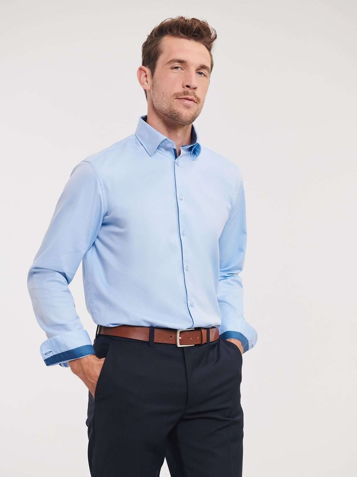 84% cotone, 16% poliestere. Camicia da uomo a maniche lunghe con bordi a contrasto, pinces sul retro per una miglior vestibilità, polsini stondati regolabili a 2 bottoni con occhiello per gemelli. (col. 30: 125 g/m)