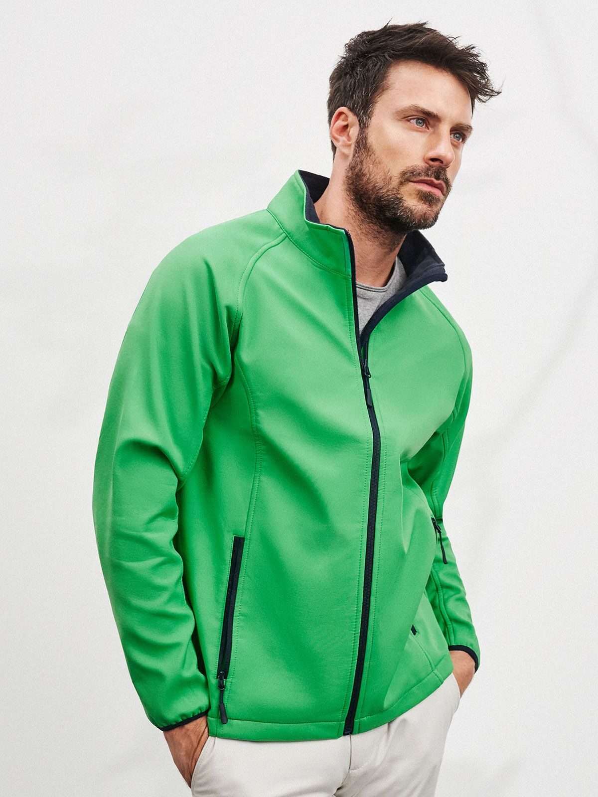 100% poliestere. Giacca in softshell a due strati, idrorepellente, antivento e traspirante. Lato interno in morbido micropile, zip frontale lunga con protezione per il mento. 2 tasche laterali con zip, 2 tasche interne, polsini elastici.