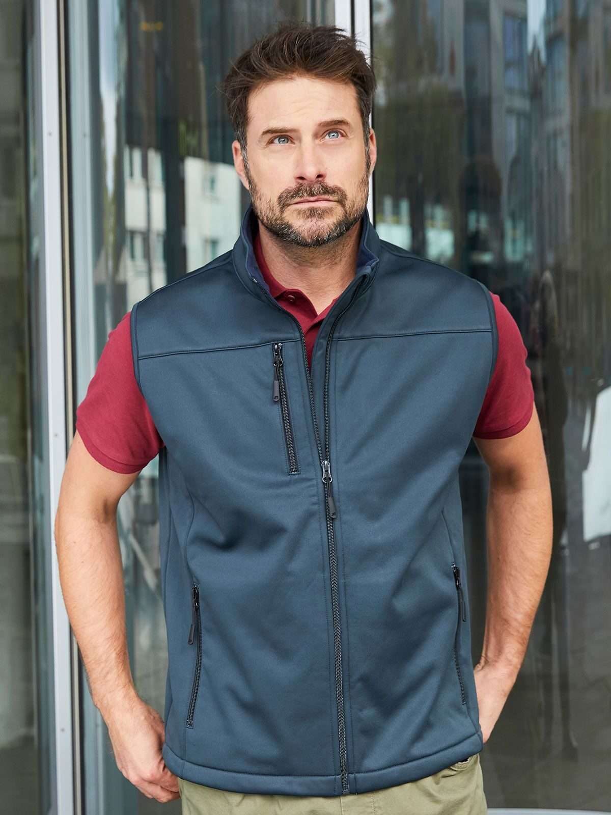 100% poliestere riciclato. Gilet softshell sportivo, a 3 strati con membrana TPU, antivento e idrorepellente (5,000mm colonne), traspirante e permeabile al vapore acqueo, interno in pile e rivestimento in mesh sul davanti, colletto alto, 2 tasche laterali e un taschino sul petto con zip YKK.