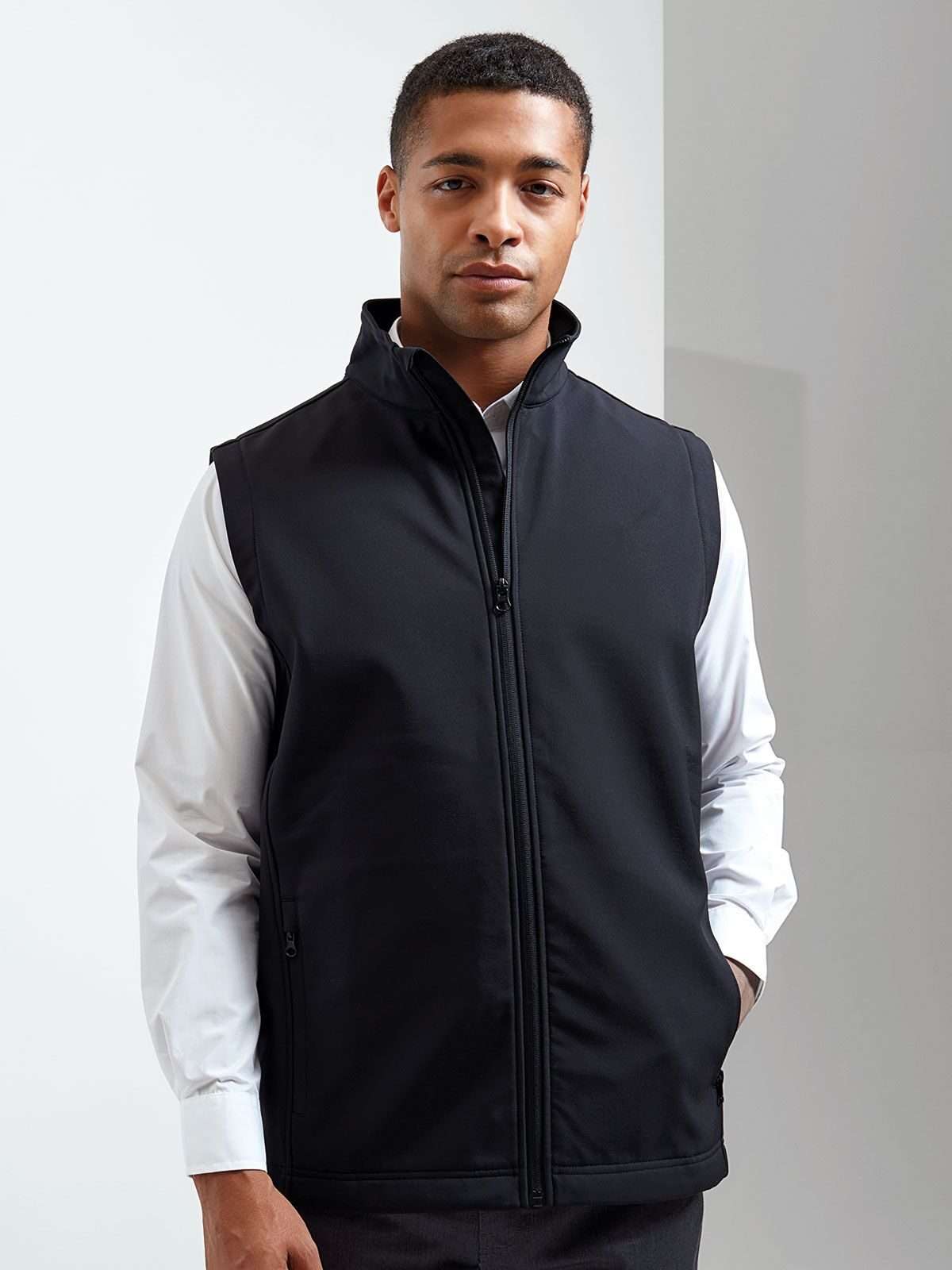 100% poliestere riciclato. Gilet softshell a due strati con interno in pile, tasche laterali con cerniera, colletto rialzato, tessuto impermeabile e antivento, coulisse elasticizzata sull'orlo, due tasche interne, adatto a ricamo, transfer e serigrafia.