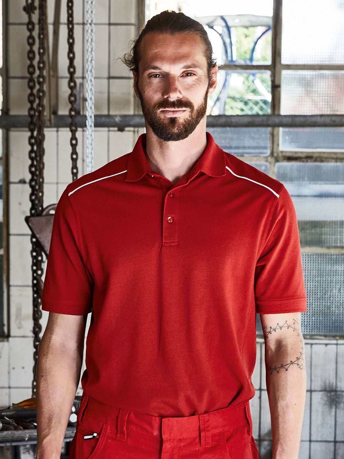 50% cotone, 50% poliestere. Polo da lavoro in tessuto misto cotone organico ring-spun e poliestere per un perfetto mantenimento della forma e resistenza al lavaggio, colletto polo e bordini manica lavorati a maglia, chiusura a 3 bottoni, inserti contrastanti sul davanti e sul retro, lavabile a 60° C, ideale per asciugatura in asciugatrice.