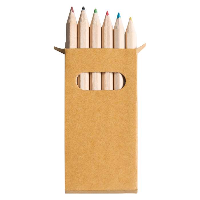 set 6 mini pastelli ; custodia in cartoncino naturale ; forniti già temperate ; tecnica di stampa consigliata: serigrafica - tampografica - UV