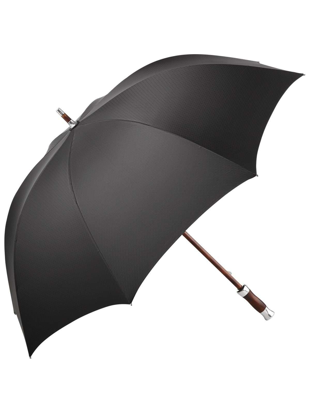 Elementi con cromatura lucida, impugnatura diritta in vero legno di acero fiammato con applicazioni cromate, stecche in fibra di vetro flessibili, pregiato sistema Windproof per una flessibilità massima del telaio in caso di forti raffiche di vento, classica fodera Façonné, chiusura in velcro con bottone a pressione cromato, custodia pregiata con bordatura e ampia apertura, cerniera di apertura cromata. Diameter: 115 cm, lunghezza da chiuso: 87 cm, 8 pannelli.