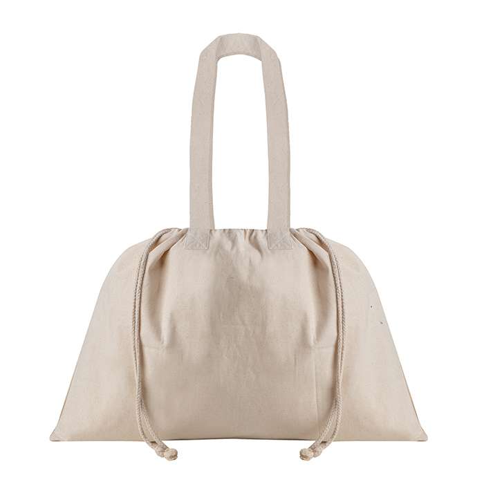 borsa; doppia corda di chiusura; manici lunghi; colore naturale; rifiniture cucite; tecnica di stampa consigliata: serigrafica - transfer - digitale; 135 GR