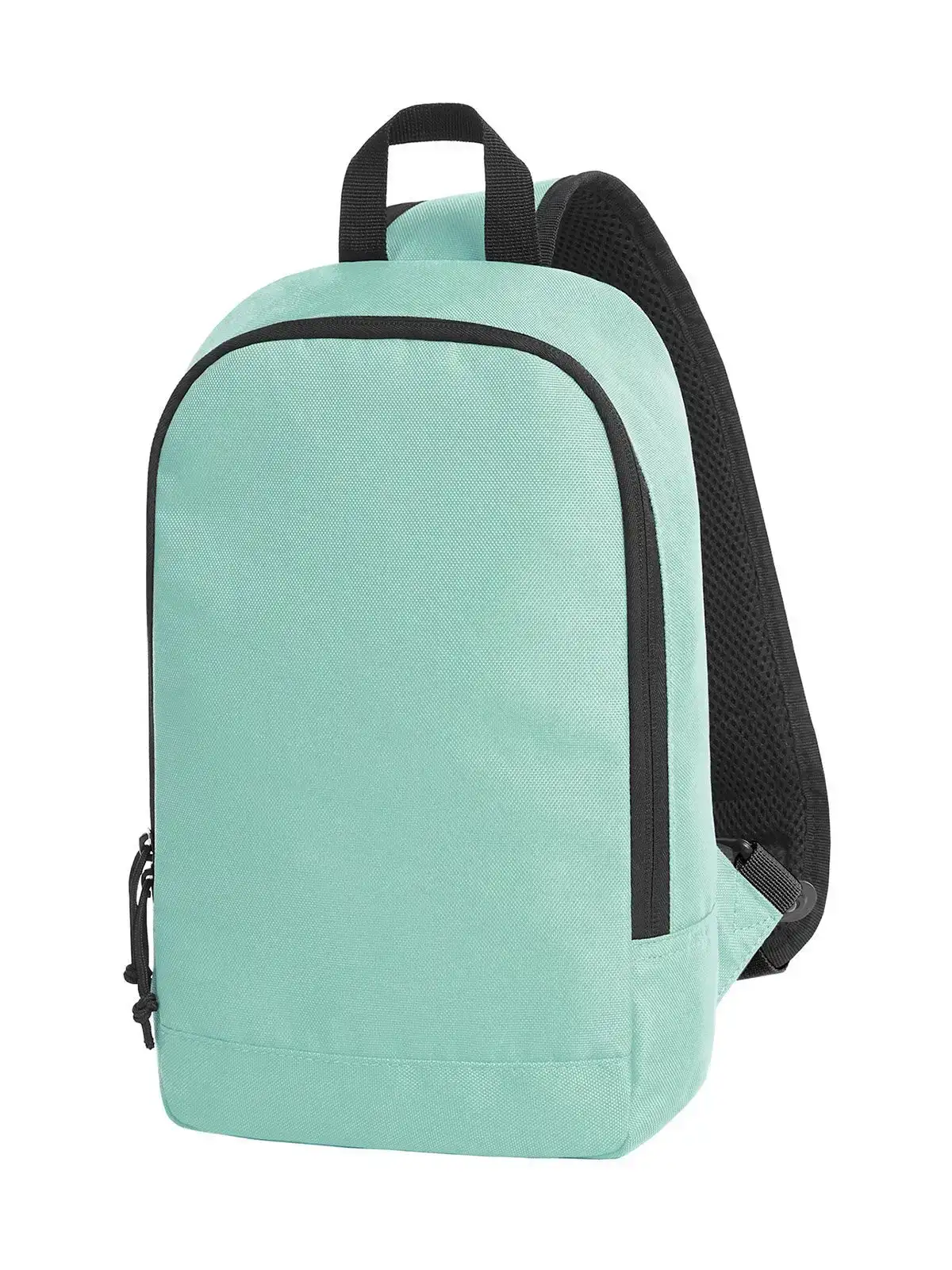 100% poliestere. Zaino monostrappo, scomparto principale con cerniera a 2 vie, tasca a inserto piatta interna, tasca con chiusura lampo sul reto, spallaccio imbottito, di lunghezza regolabile e trasportabile su entrambi i lati, passante di trasporto. Dimensioni: 18x30x8 cm. Area personalizzabile: frontale 12x17 cm.