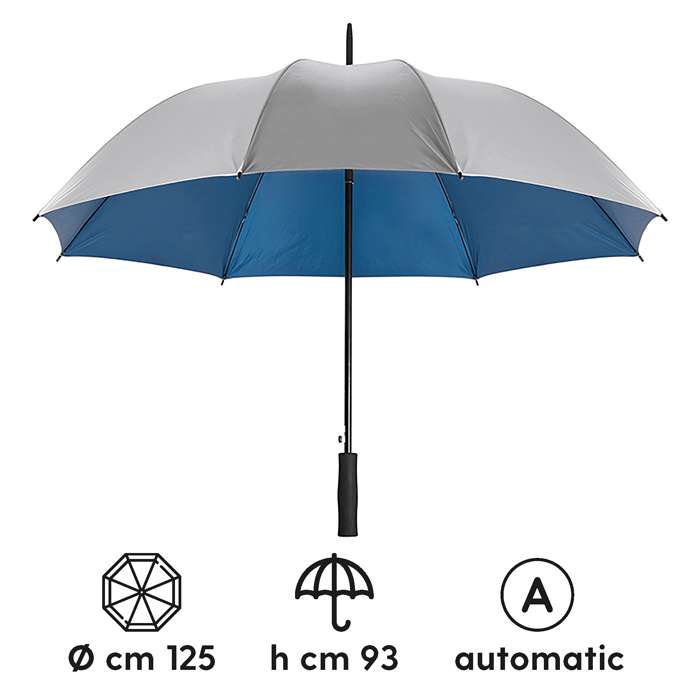maxi ombrello automatico; sistema di apertura con meccanica di alta qualit��; struttura in fibra di vetro; fusto e puntale in metallo nero; manico in eva; colore interno a contrasto; chiusura con velcro; tecnica di stampa consigliata: serigrafica - transfer