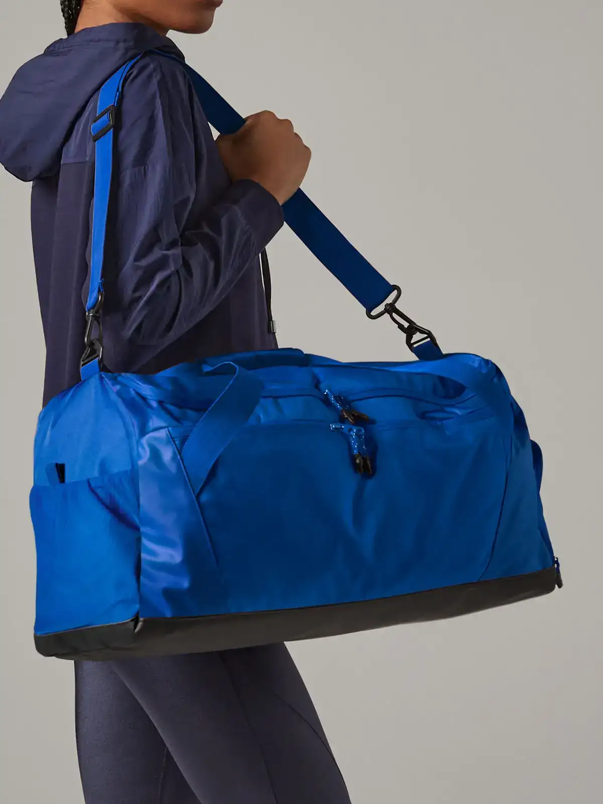 100% poliestere riciclato. Borsone in poliestere riciclato certificato GRS, apertura con due zip bidirezionali, tasca dedicata per racchetta, adatto per racchette fino a circa 23cm di larghezza, manicotto per mazza da hockey con elastico di fissaggio, tasca porta scarpe e tasca impermeabile porta indumenti bagnati, tasca frontale con zip, tasca posteriore con zip, tasca laterale in rete elasticizzata, tracolla regolabile e removibile. Dimensioni: 51x26x20 cm, Capacit??: 26 litri. Etichetta strappabile.