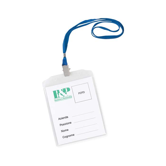 portabadge con nastrino e clip nichelata; cartoncino neutro incluso; tecnica di stampa consigliata: serigrafica
