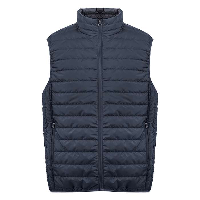 Gilet trapuntato effetto piuma; cerniera in tinta con protezione mento; tasche laterali con cerniera; indumento leggero e pieghevole
