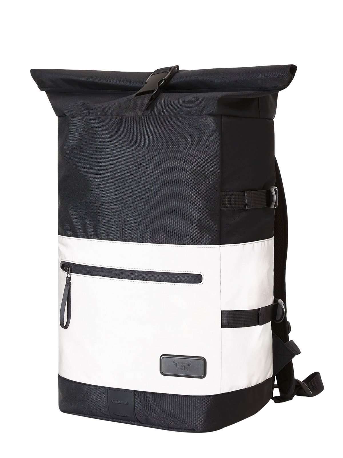 Poliestere. Poliestere 600d/PU, tessuto riflettente. Tutti i materiali sono conformi alle ultime specifiche UE, senza PVC. Zaino roll-top alla moda, riflettente, scomparto principale con cerniera e fibbia, cinghie HFL per il tuo logo, tasca imbottita e tasca a rete con zip all'interno, due tasche laterali a scomparsa, cinghia di fissaggio, tasca frontale con zip, opzione di attacco luce per bici a LED, anello di aggancio posteriore trolley. Dimensione: 30 x 44/64 x 18 cm. Capacità: 22/28 lt
