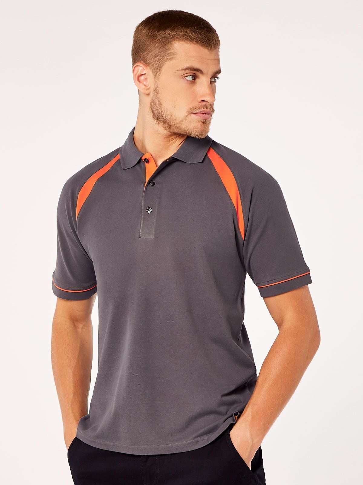 100% cotone piqué pettinato. Polo a maniche corte raglan, parte interna del colletto di colore contrastante, inserti di colore contrastante, 3 bottoni tono su tono, struttura con cuciture e spacchetti laterali.
