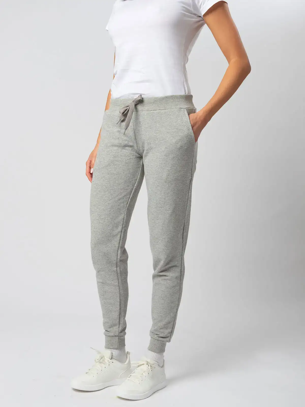 80% cotone, 20% poliestere. Pantaloni donna con polsini alle caviglie, non felpati, due tasche laterali, elastico in vita con cordoncino tono su tono.