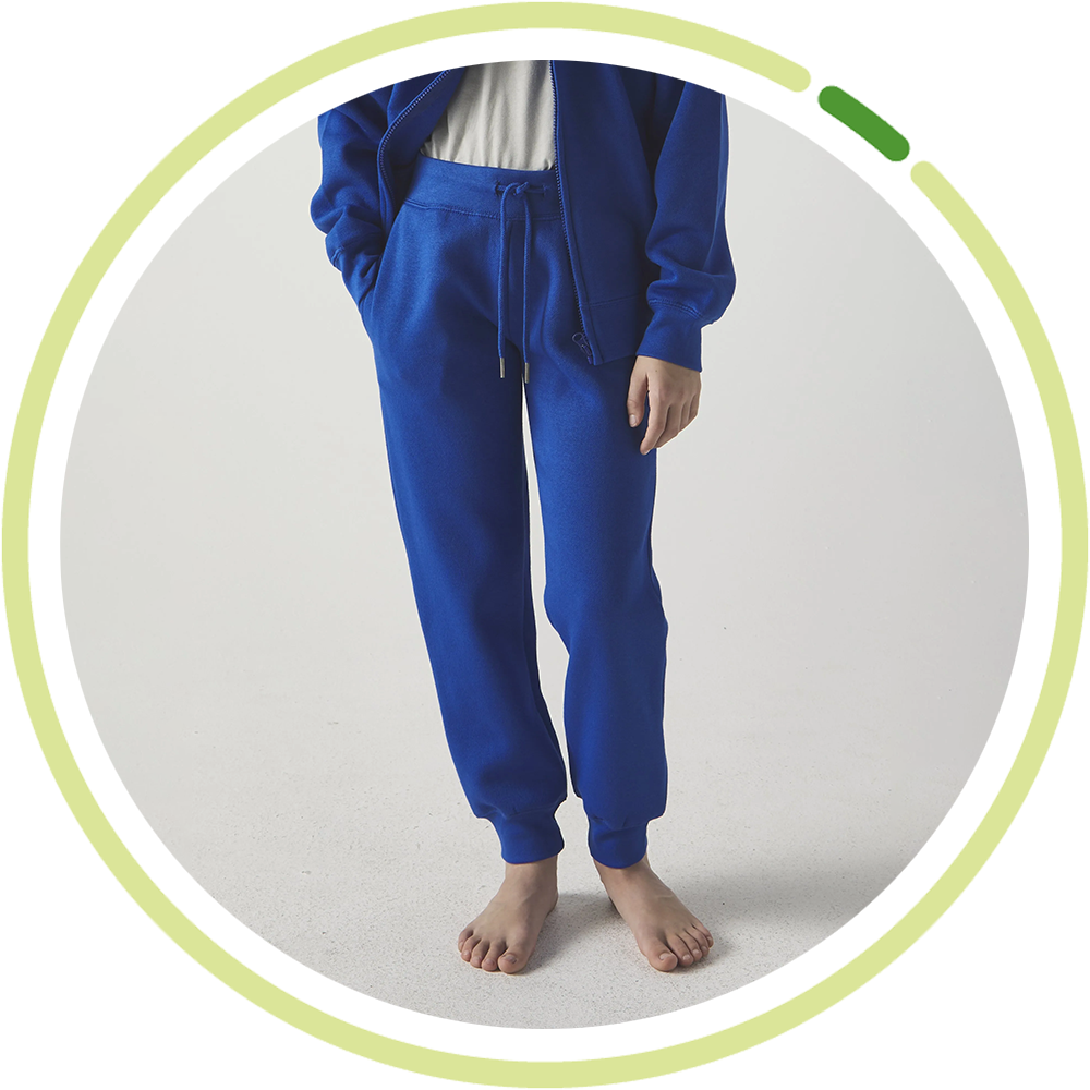 80% cotone, 20% poliestere. Pantaloni con elastico in vita e cordoncino, due tasche laterali, elastico alla caviglia, felpati internamente. Etichetta removibile. (Col. 94: 260 g/m²).