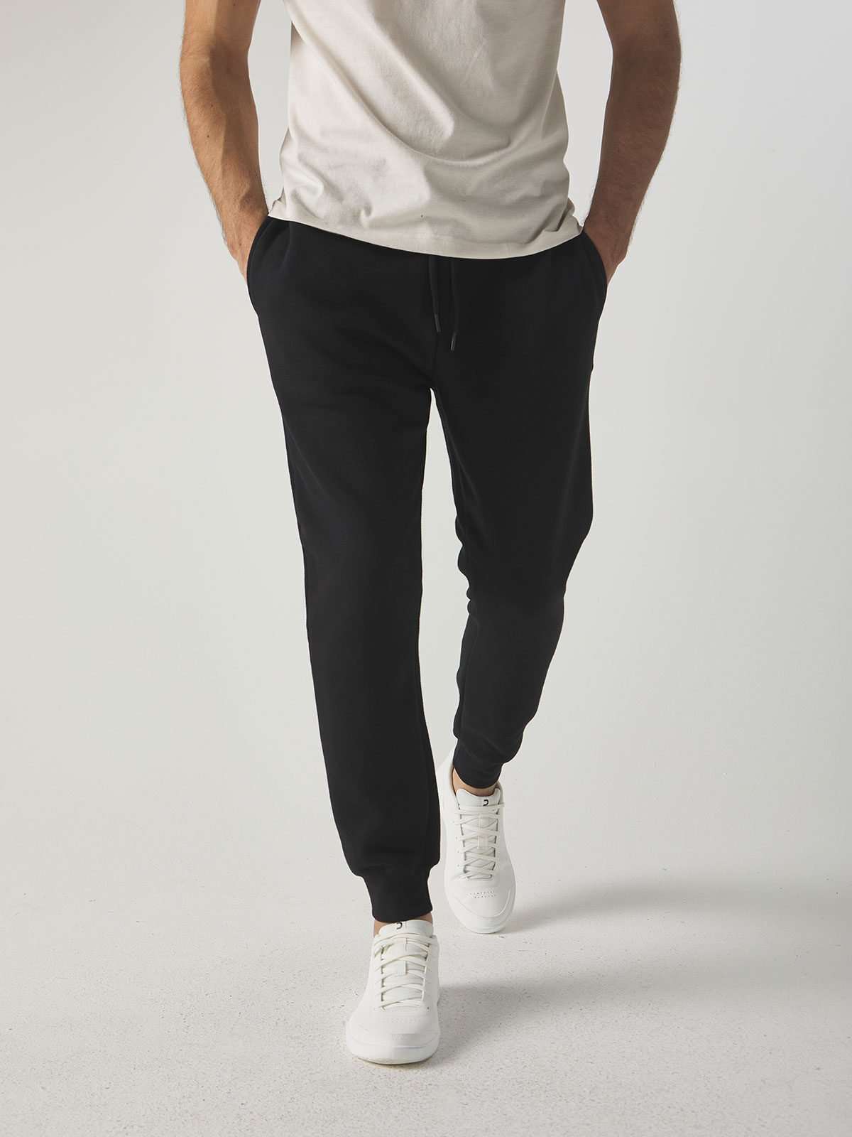 70% cotone pettinato, 30% poliestere. Tessuto interno in poliestere ed esterno 100% cotone. Pantaloni felpati internamente, tasche a filetto dello stesso tessuto, tasca posteriore con toppa, cordoncino in tinta con estremità in plastica. Etichetta strappabile.
