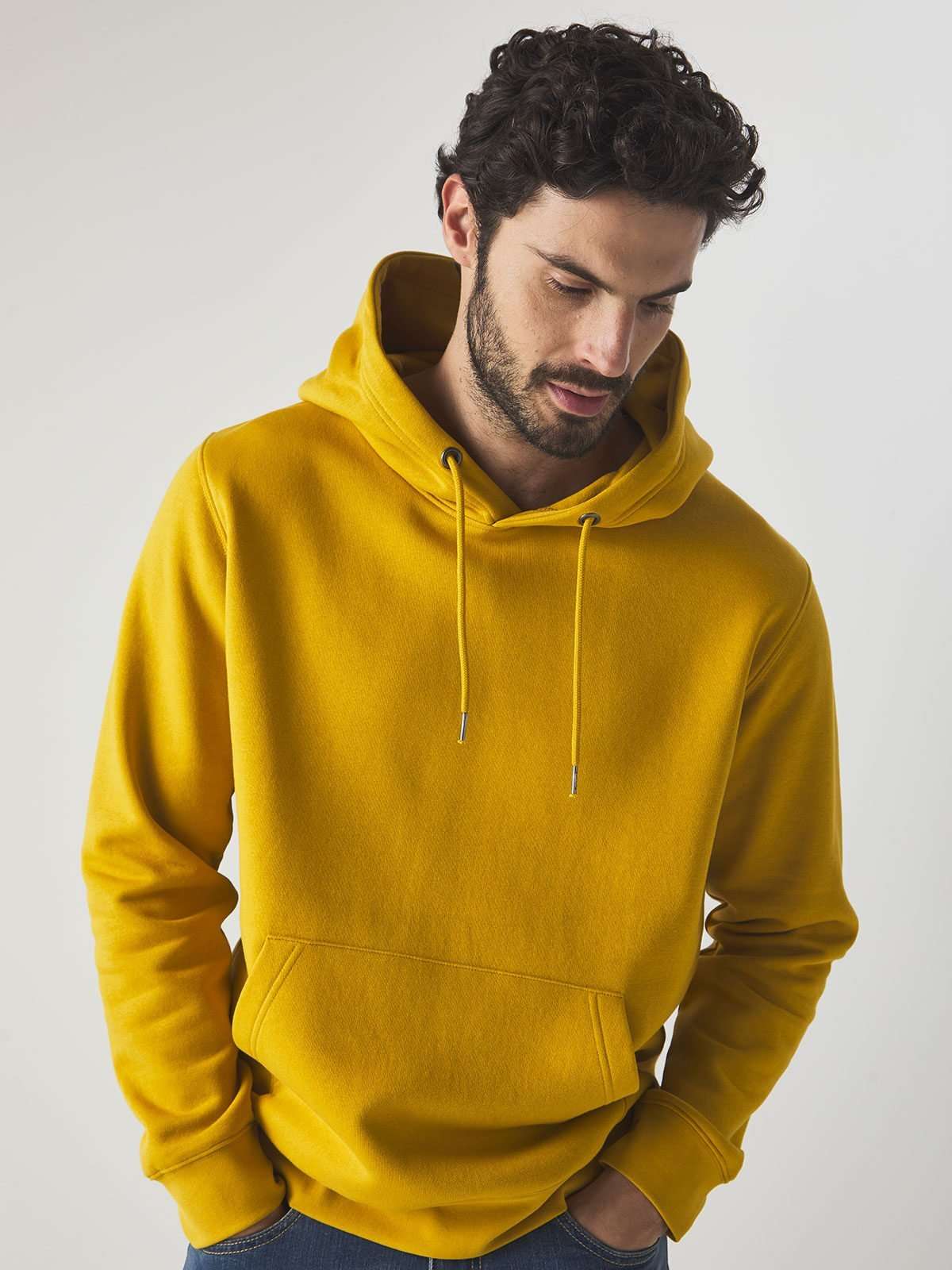 80% cotone organico, 20% poliestere riciclato. Felpa con cappuccio a doppio strato, genderless, morbido tessuto ecosostenibile trattato ad enzimi, occhielli in metallo, cordini con punta in metallo, maniche set-in, grande tasca a marsupio, struttura con cuciture laterali, fascia in vita e polsini in costina. Felpata internamente, ed esterno 100% cotone per una migliore stampabilità. Etichetta taglia tessuta al collo ed etichetta laterale strappabile con logo, composizione e istruzioni di lavaggio.