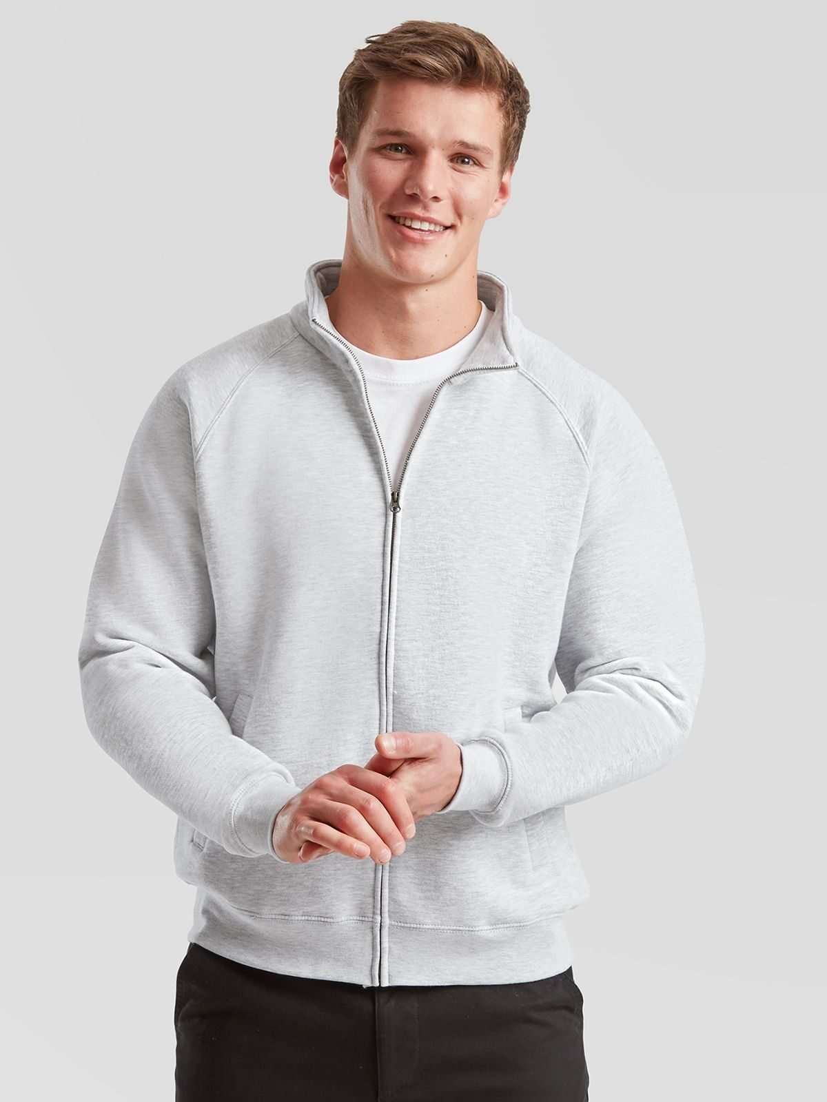 70% cotone, 30% poliestere. Felpa con maniche raglan, felpata internamente, due tasche frontali, zip intera nascosta per favorire la stampa, struttura con cuciture laterali. Etichetta removibile.