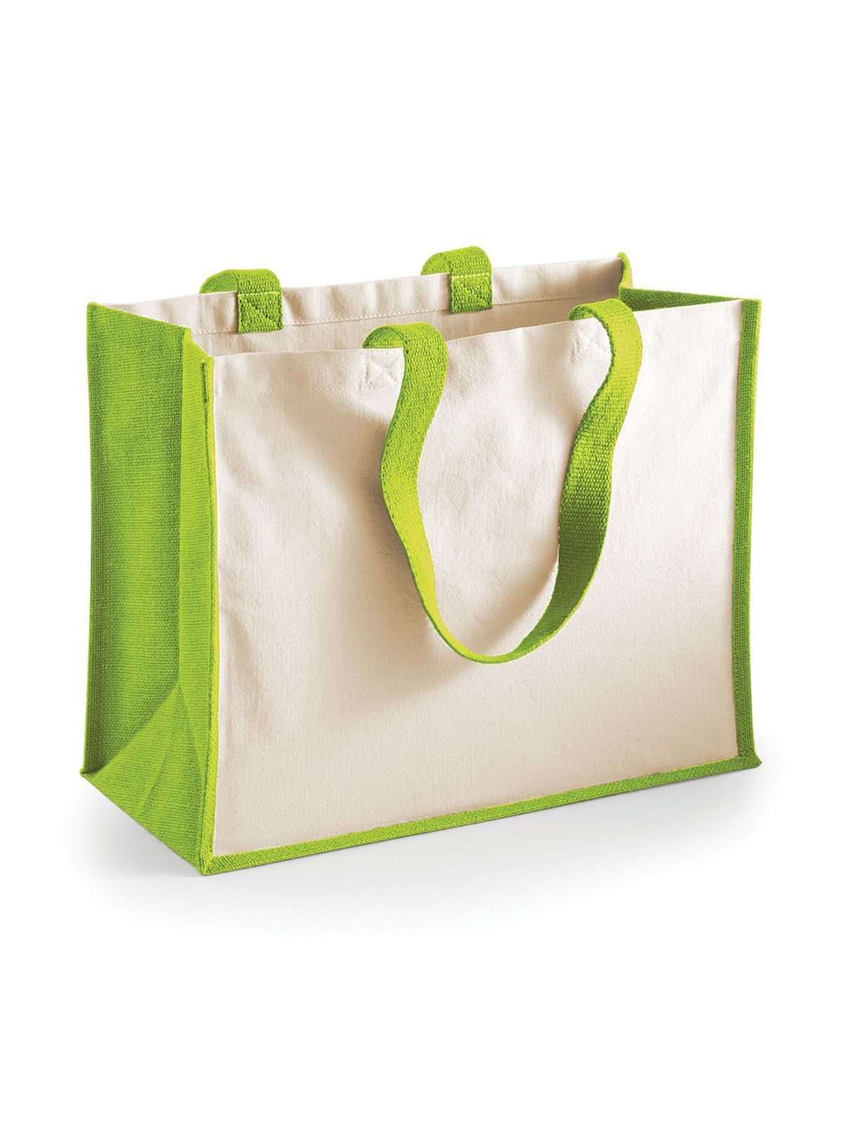 100% Juta laminata e cotone canvas. Shopper con pannelli laterali in cotone Canvas. Etichetta removibile. Lunghezza manici: 60 cm, dimensioni: 42 x 33 x 19 cm, capacita': 21 litri, area stampabile: 34 x 26 cm.