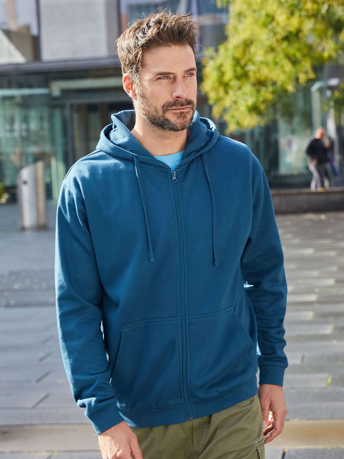 80% cotone, 20% poliestere. Felpa con zip e cappuccio a due strati con cordini, felpata internamente, tasca marsupio, nastro di rinforzo al collo, polsini con elastane, etichetta Tear-off.