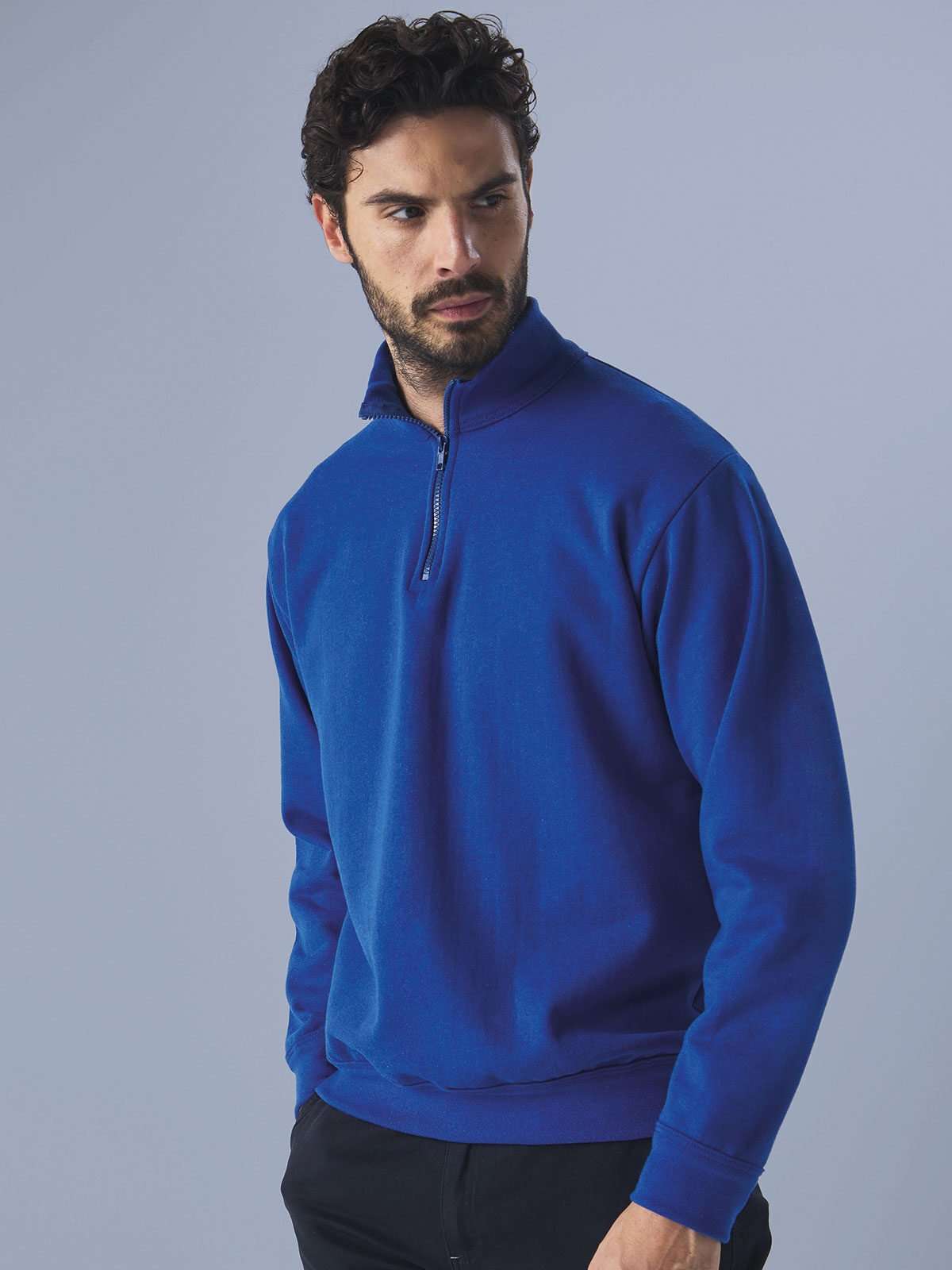 65% cotone riciclato, 35% poliestere riciclato. Felpa mezza zip in tessuto di cotone e poliestere riciclati, manica dritta, felpata internamente. Produzione interamente italiana. Cerniera in plastica, tirazip in metallo. Cuciture laterali. Etichetta strappabile.