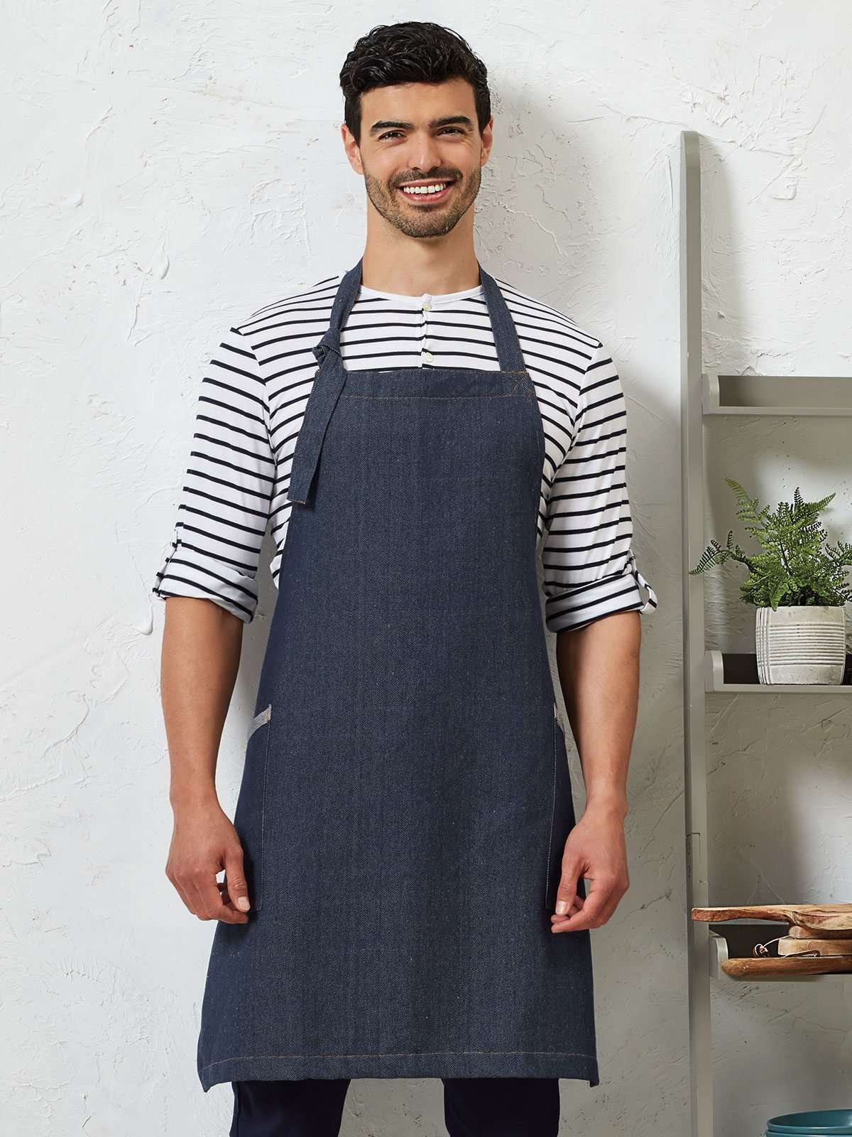 Naturale: 46% cotone riciclato, 35% poliestere riciclato, 19% fibre miste. Denim nero: 56% cotone riciclato, 38% poliestere riciclato, 6% fibre miste. Denim indaco: 59% cotone riciclato, 33% poliestere riciclato, 8% fibre miste. Denim grigio: 55% cotone riciclato, 35% poliestere, 10% fibre miste. Grembiule con pettorina, tasche laterali con inserto a contrasto, laccio al collo regolabile con nodo.