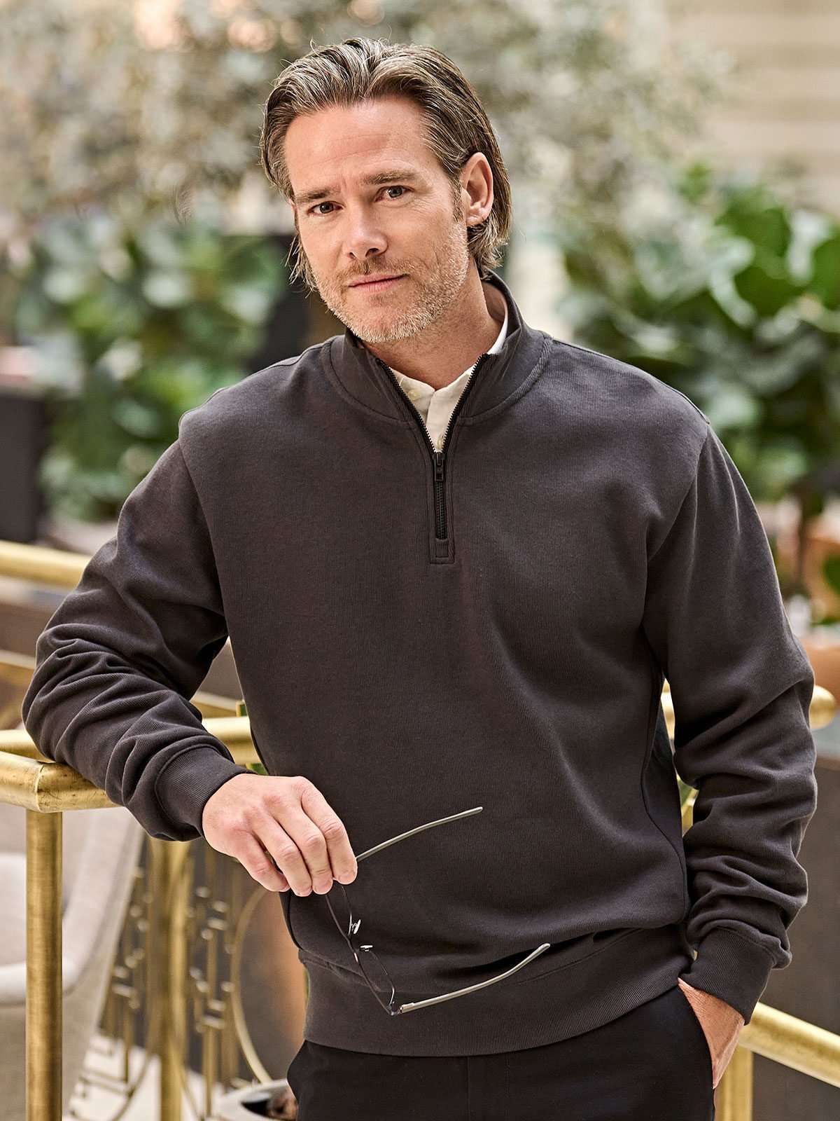 80% cotone 20% poliestere. Felpa mezza zip in interlock a coste, polsini, collo e fascione a costine con elastane, cerniera SBS.