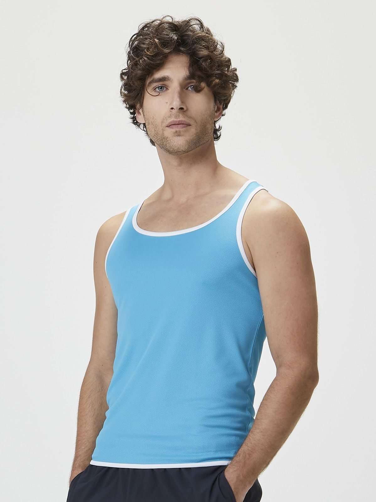 100% poliestere. Canotta sportiva unisex, profondo girocollo, regolazione dell'umidità e asciugatura rapida, orlo su collo, giromanica e orlo inferiore di colore contrastante, struttura con cuciture laterali. Etichetta strappabile.