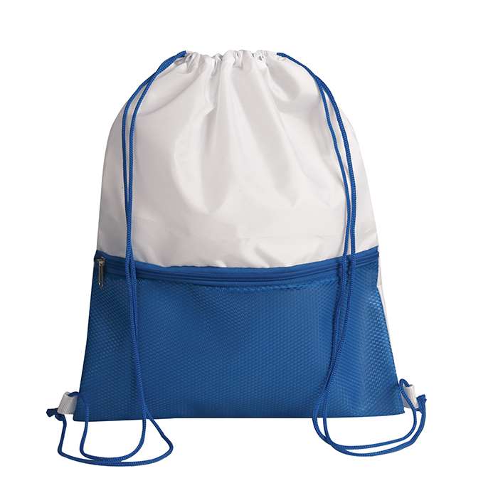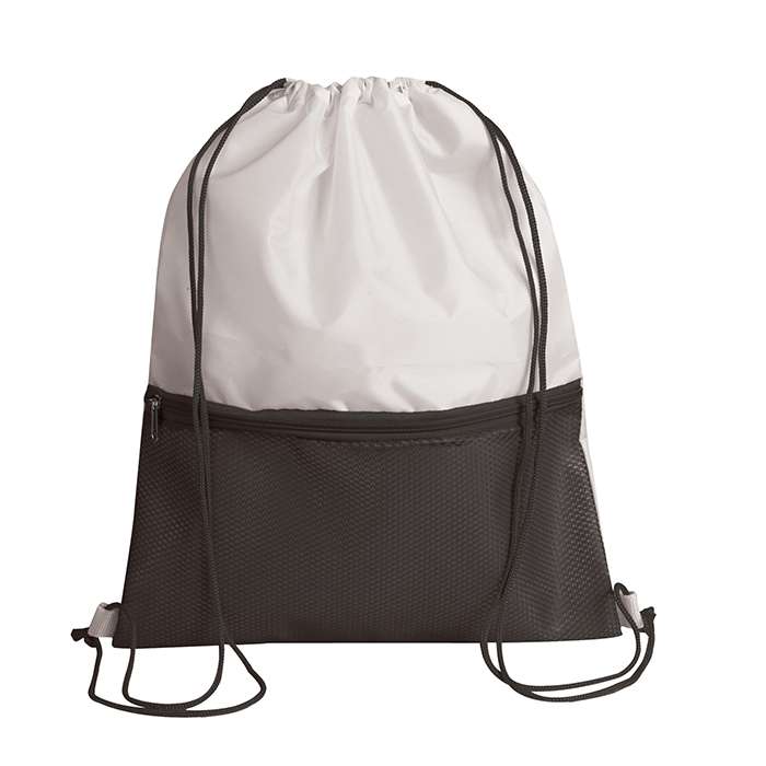 sacca zaino nylon 210D; tasca frontale traforata con zip; doppio cordoncino di chiusura; tecnica di stampa consigliata: serigrafica