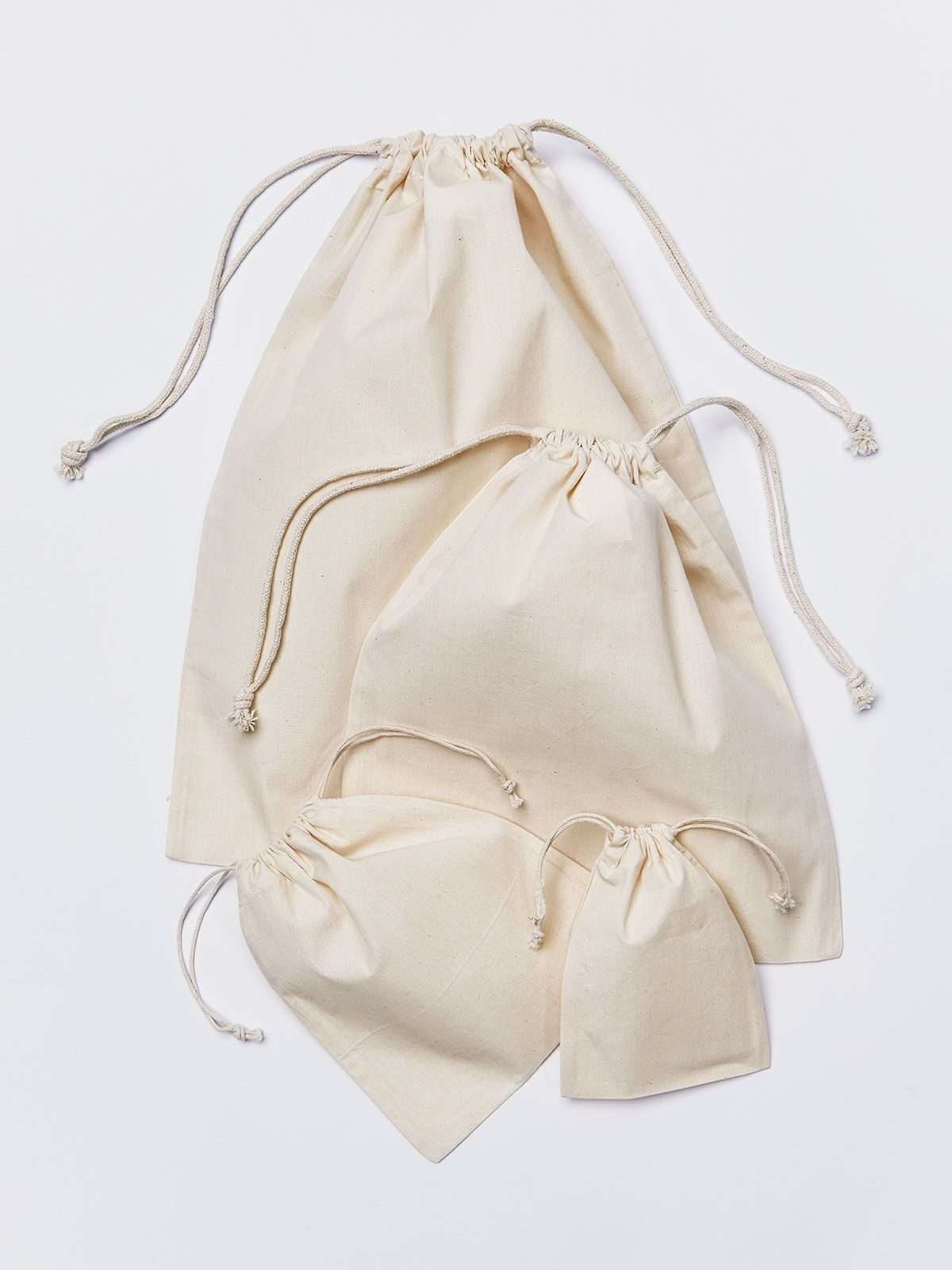 100% cotone organico. Sacchetti con cordino doppio in colore naturale. Dimensioni: XS: 10x15 c, cap. 0,25 lt. - S: 15x20 cm, cap. 1 lt. - M: 25x30 cm, cap. 3 lt. - L: 30x40 cm, cap. 7 lt.