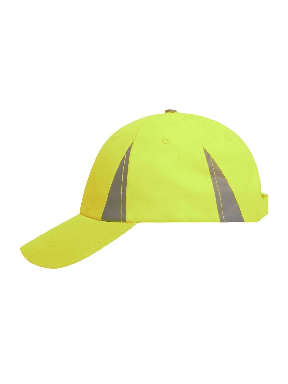 100% poliestere. Safety cap con 4 fori di ventilazione ricamati, 6 cuciture decorative sulla visiera, inserti riflettenti sui pannellli, pannelli frontali laminati, chiusura in velcro, taglia unica.