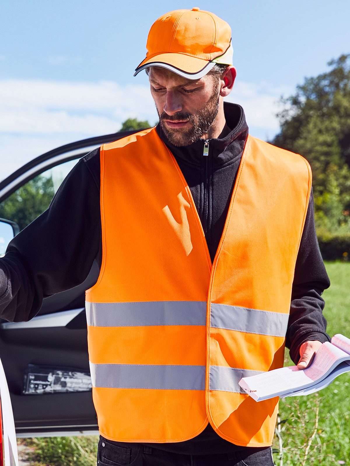 100% poliestere. Gilet di sicurezza, taglia unica S-XXL per adulti. Materiale catarifrangente con strisce riflettenti. EN ISO 20471:2013+ A1:2016 classe 2, Chiusura in velcro. Il gilè può essere ripiegato in un sacchetto separato.
