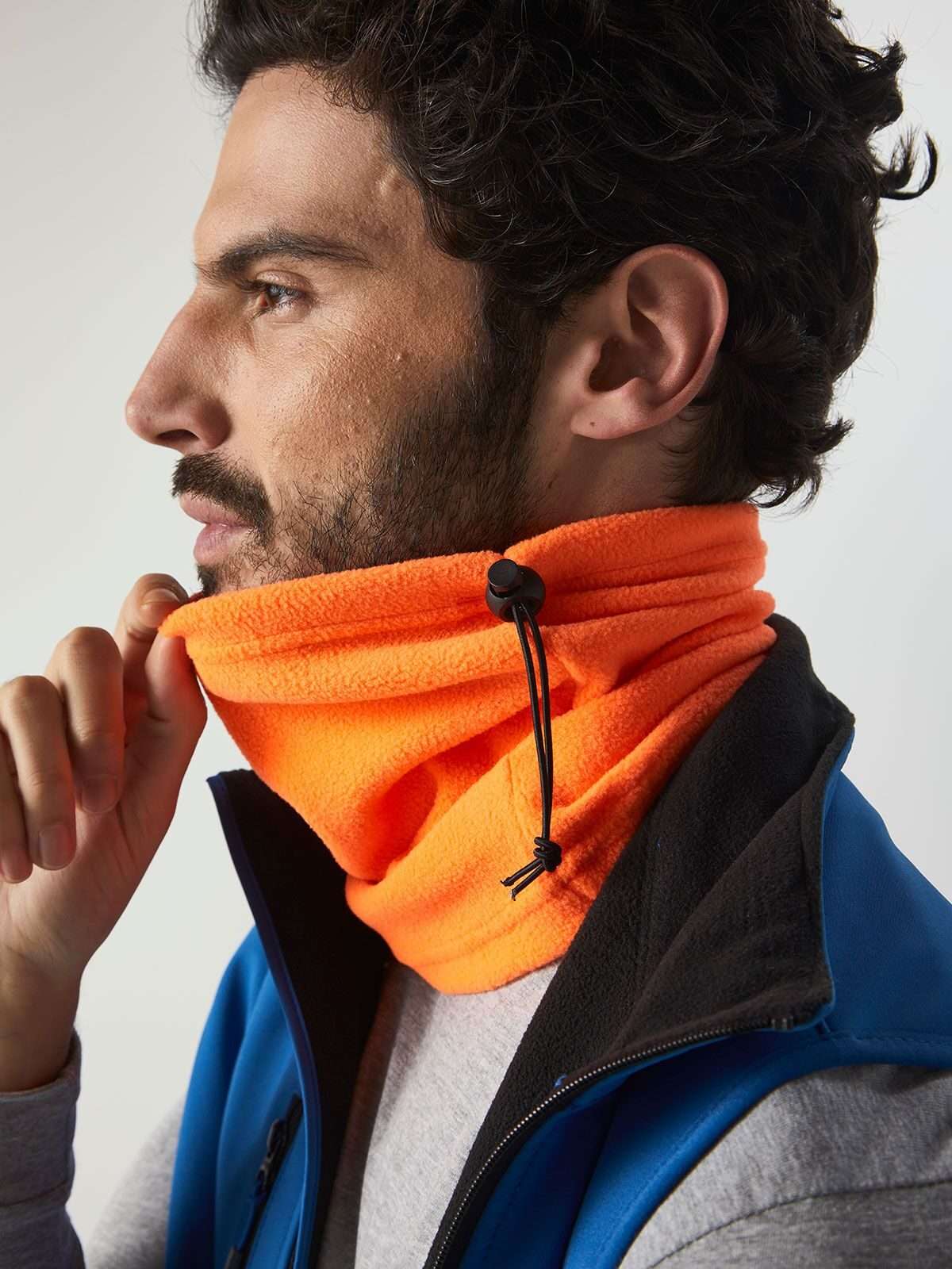 100% poliestere. Scaldacollo in tessuto ultra termico in pile, utilizzabile anche come berretto, dotato di cordoncino elastico con levetta.