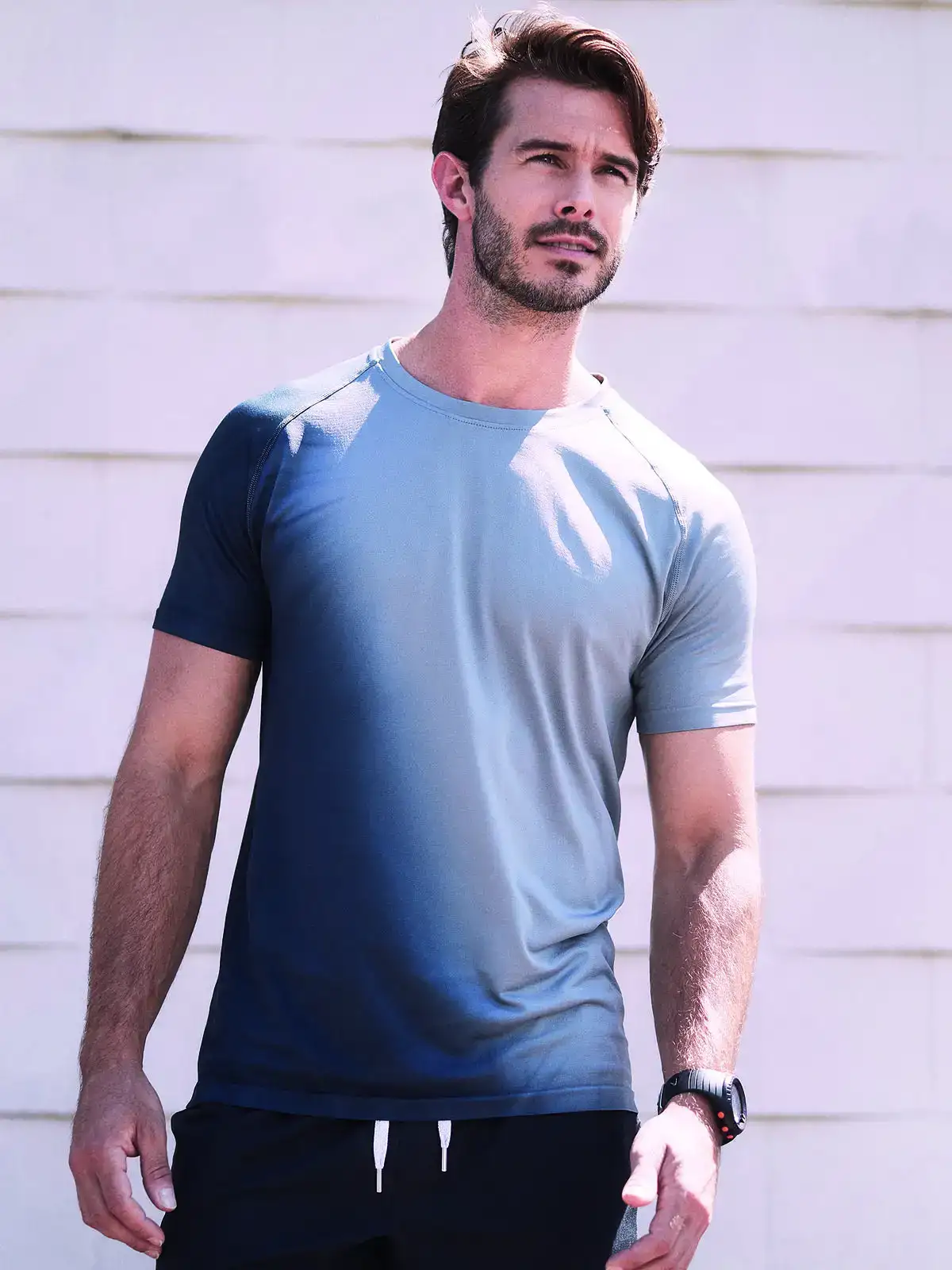 100% nylon. T-shirt sportiva da uomo, senza cuciture, maniche raglan, nastro al collo tono su tono. Etichetta taglia tessuta al collo, etichetta di manutenzione a strappo laterale.