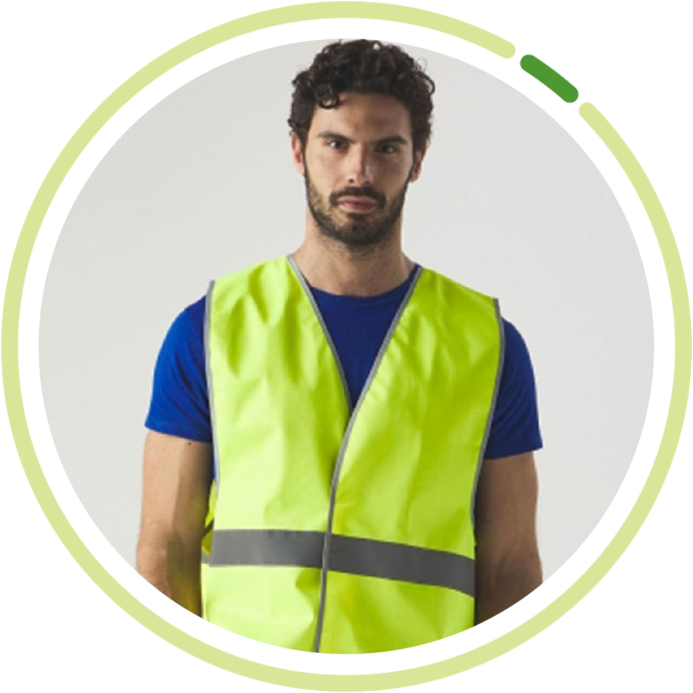 100% poliestere. Gilet ad alta visibilità certificato EN ISO 20471:2013/A1:2016. Realizzato con materiali conformi allo STANDARD 100 by OEKO-TEX®. Dotato di due bande riflettenti da 5 cm che circondano il corpo, assicurando un’elevata visibilità in ogni condizione. La vestibilità è regolabile grazie a due chiusure in velcro, mentre il produttore certifica la durata delle proprietà riflettenti fino a 25 cicli di lavaggio a 40°C, in linea con gli standard EN. Ogni capo è fornito con etichetta dotata di EAN/barcode scansionabile ed è confezionato singolarmente.