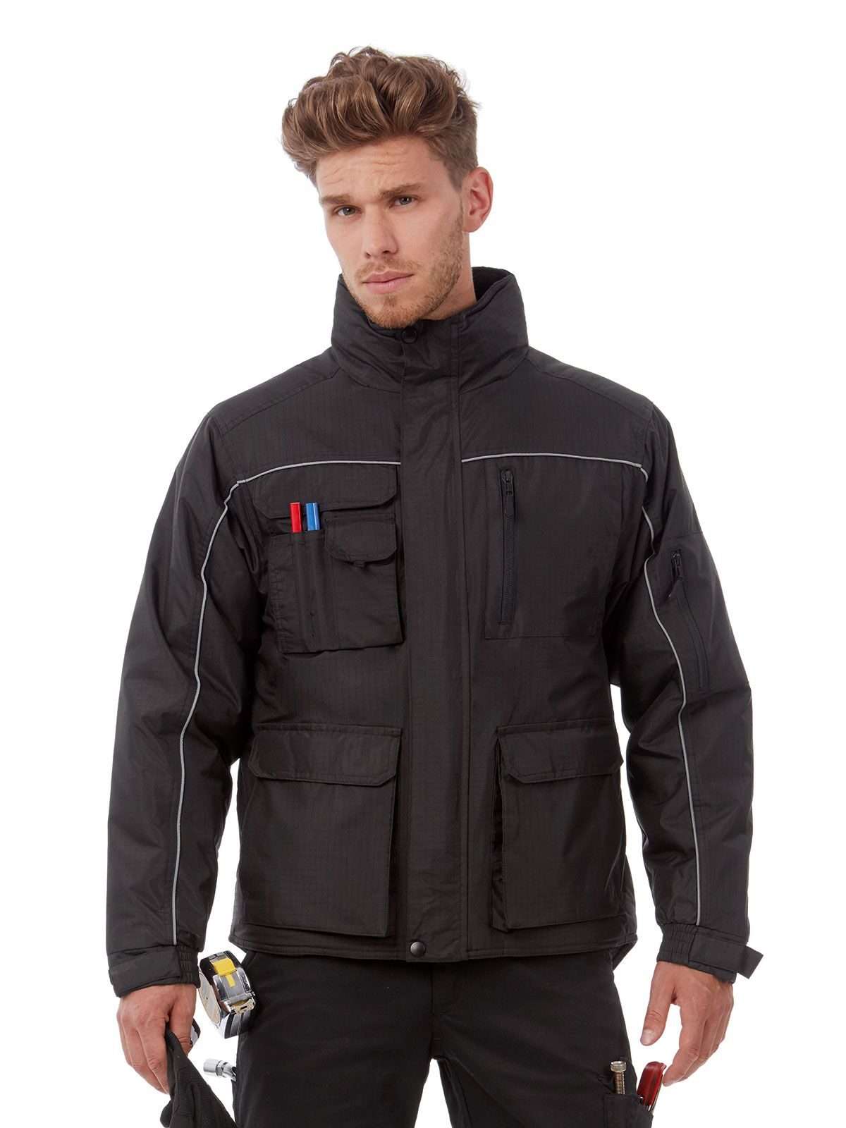 100% poliestere. Giacca pesante, impermeabile 5000 mm, antivento, cappuccio a scomparsa nel colletto, struttura ergonomica, leggermente più lunga nella parte posteriore, protezione contro il freddo, dettagli catarifrangenti sia davanti che sul retro, adatta ad ogni tecnica di stampa e ricamo su tutta l'area, 12 tasche muntifunzionali.