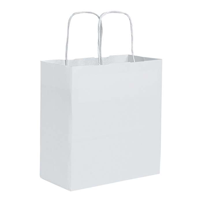 shopper in carta bianca; maniglia ritorta; soffietto; 80 g/mq; portata 2kg; tecnica di stampa consigliata: serigrafica