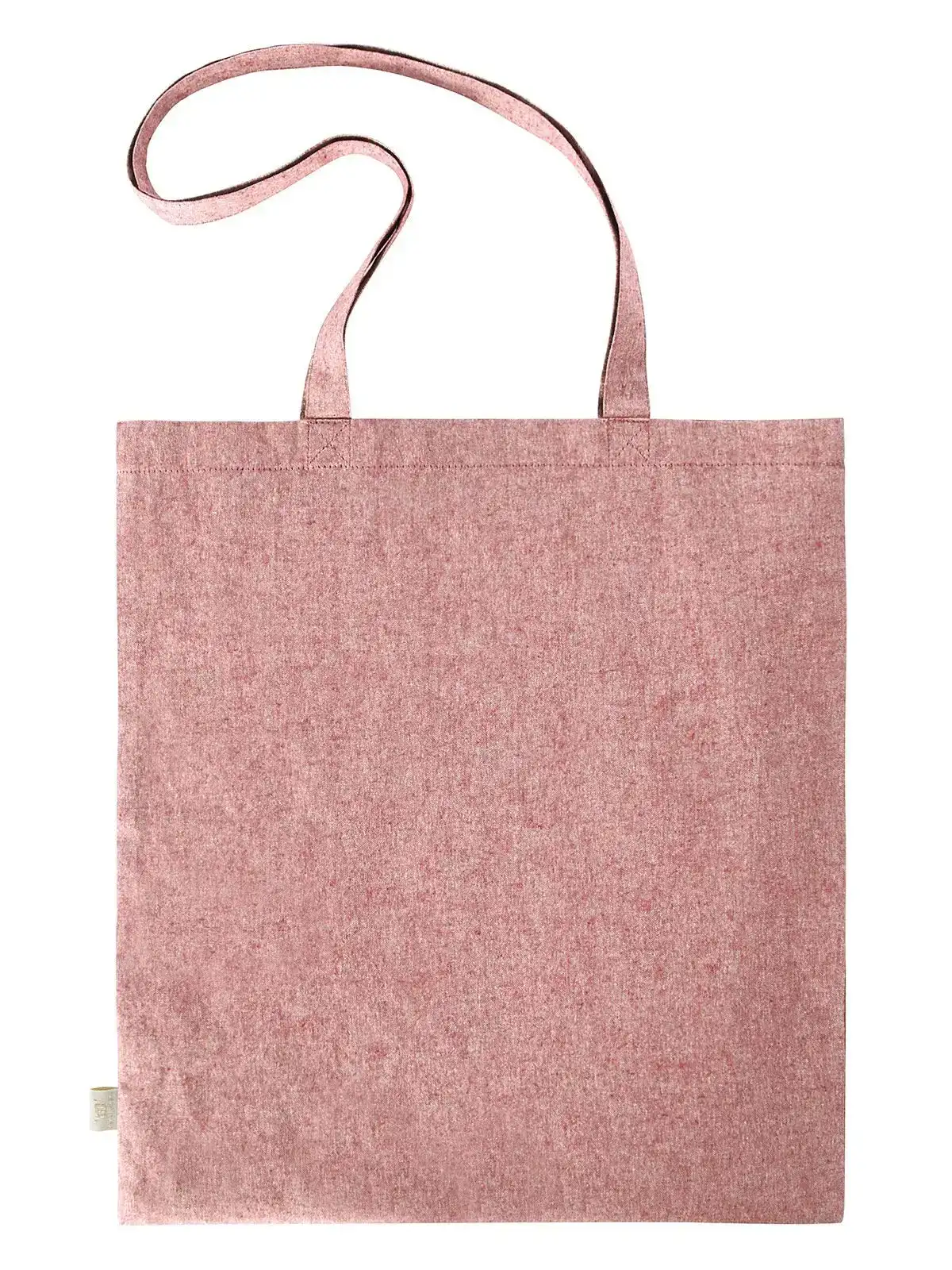 100% cotone pre-riciclato. Shopper con manici lunghi. Dimensioni: 38x42 cm. Area personalizzabile: frontale 28x31 cm.