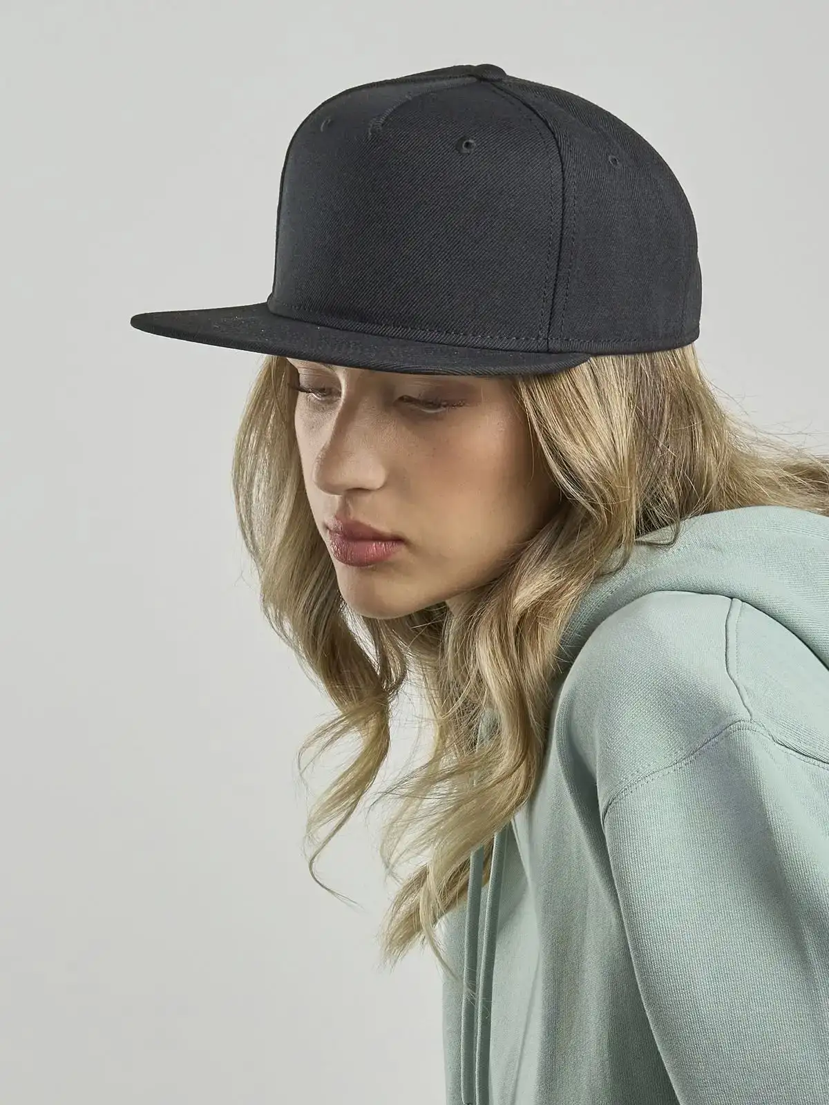 100% poliestere twill riciclato. Cappello 5 pannelli in poliestere riciclato, con visiera piatta e chiusura snapback in in PVC riciclato, etichetta removibile.