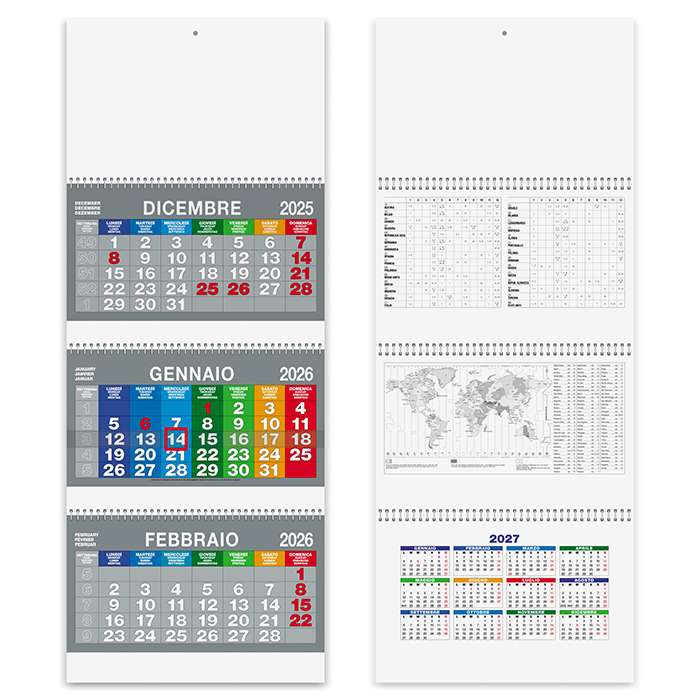 calendario trittico 3 spirali ; 3 blocchi da 12 fogli ; carta naturale 70gr ; testata e supporto cartoncino lusso 600gr ; notizie utili stampate sul supporto in cartoncino ; festività internazionali ; cursore incluso montato ; tecnica di stampa consigliata: adesivo digitale - serigrafica ; tabella anno 2027 in ultima pagina