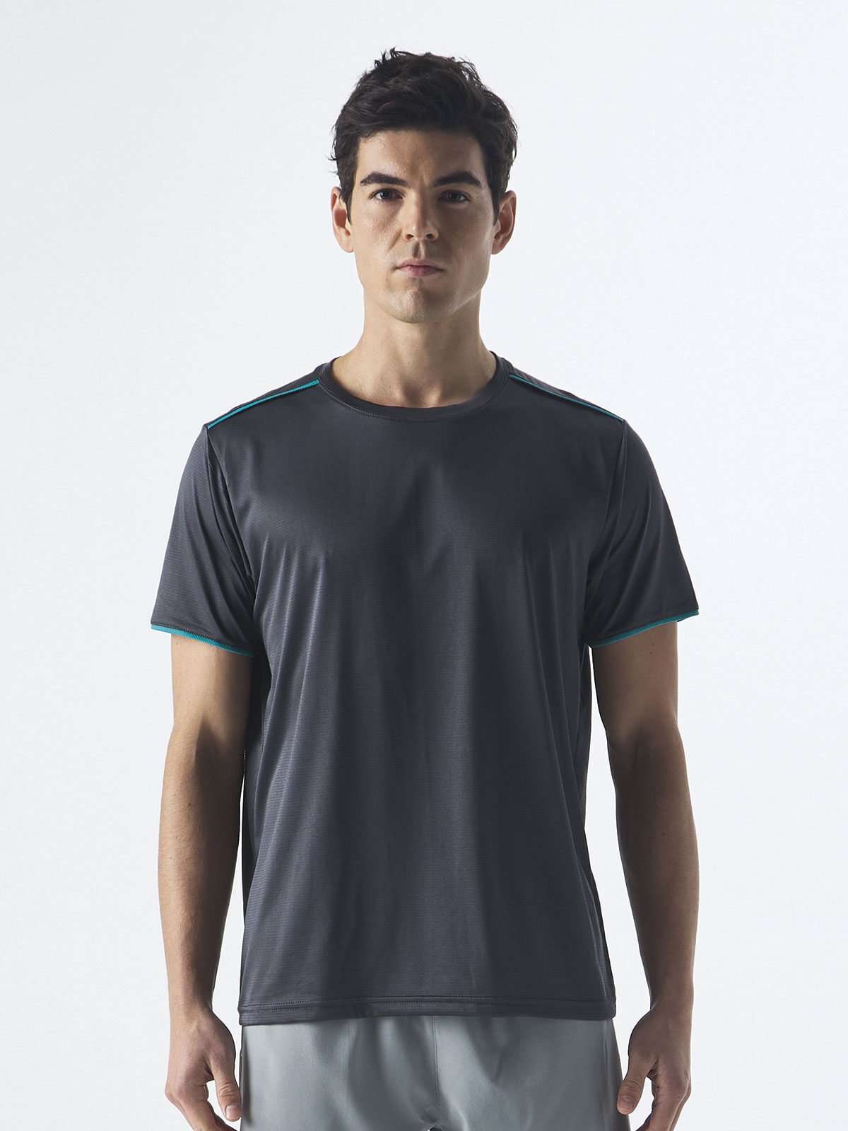100% poliestere. T-shirt tessuto performance, maniche set in, parasudore in contrasto, bordini in colore a contrasto su linea spalle davanti e dietro e su fondo manica, cuciture laterali, etichetta strappabile.