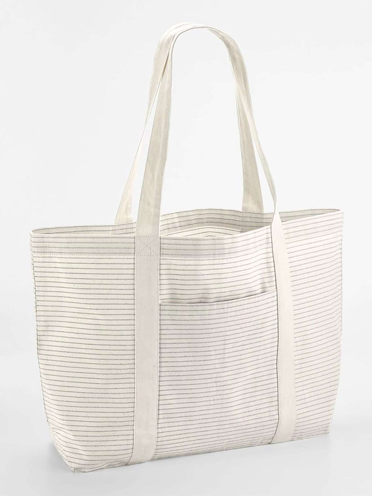 100% cotone organico. Shopper a righe in cotone organico certificato GOTS -CU811033, ampia capienza, con tasca frontale profonda, può essere portata a mano o in spalla. Lunghezza del manico: 69 cm. Dimensioni: 45x37x14cm. Capacità: 21 litri. Area di stampa: 19x24cm.Etichetta strappabile.