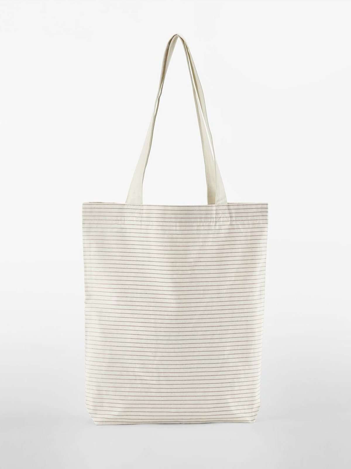 100% cotone organico. Shopper a righe in cotone organico certificato GOTS - CU811033, può essere portata a mano o in spalla. Etichetta removibile. Lunghezza manici: 67 cm. Dimensioni: 29x42x8 cm, capacità: 10 litri, area stampabile: 27x36 cm.