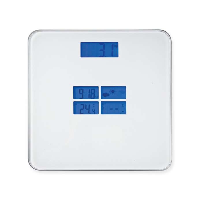 bilancia pesapersone con vetro di sicurezza 6 mm; display LCD retroilluminato; indicatore della temperatura in formato °C/°F; indicatore tendenze metereologiche; unità di misura: kg/lb/st; capacità massima Kg 180; indicatore durata batterie; batterie non incluse; spegnimento automatico