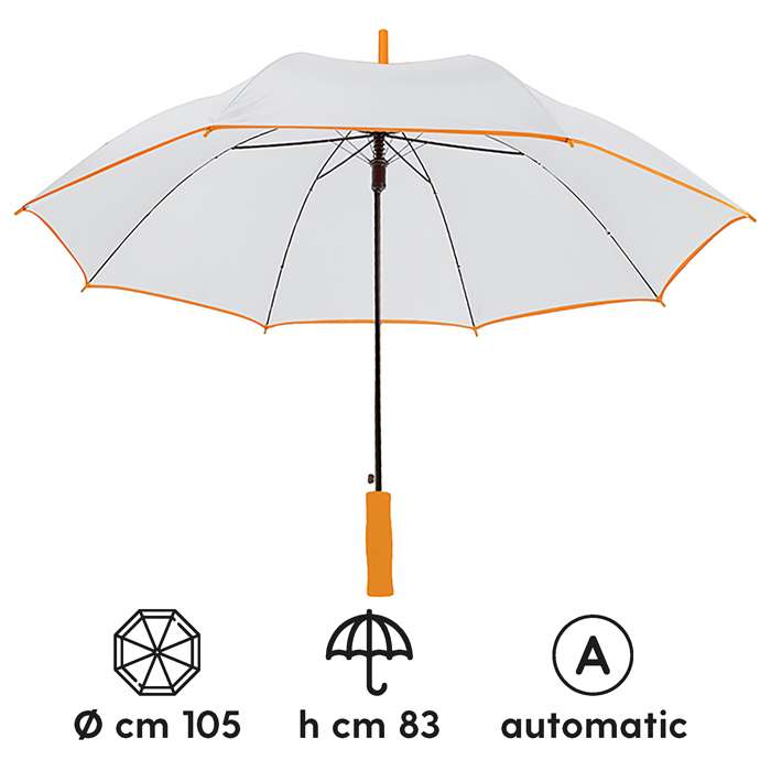 ombrello automatico; sistema di apertura con meccanica di alta qualità; struttura in fibra di vetro alta resistenza; fusto in metallo; puntale, manico in eva e bordino colorati; chiusura con velcro; tecnica di stampa consigliata: serigrafica - transfer - sublimatica