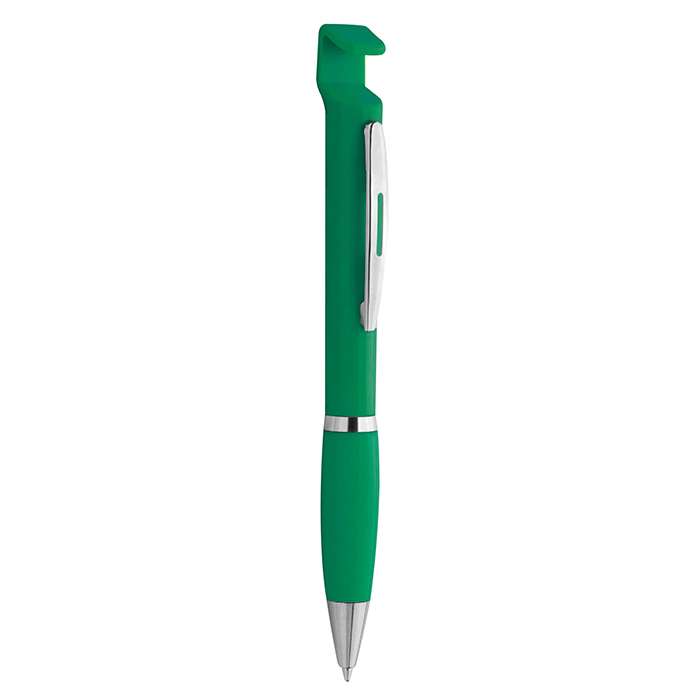 penna a sfera con supporto per smartphone; meccanismo a rotazione; corpo in plastica colorata; minuterie in metallo cromato; refill con sfera al tungsteno; inchiostro nero; tecnica di stampa consigliata: serigrafica - tampografica - UV