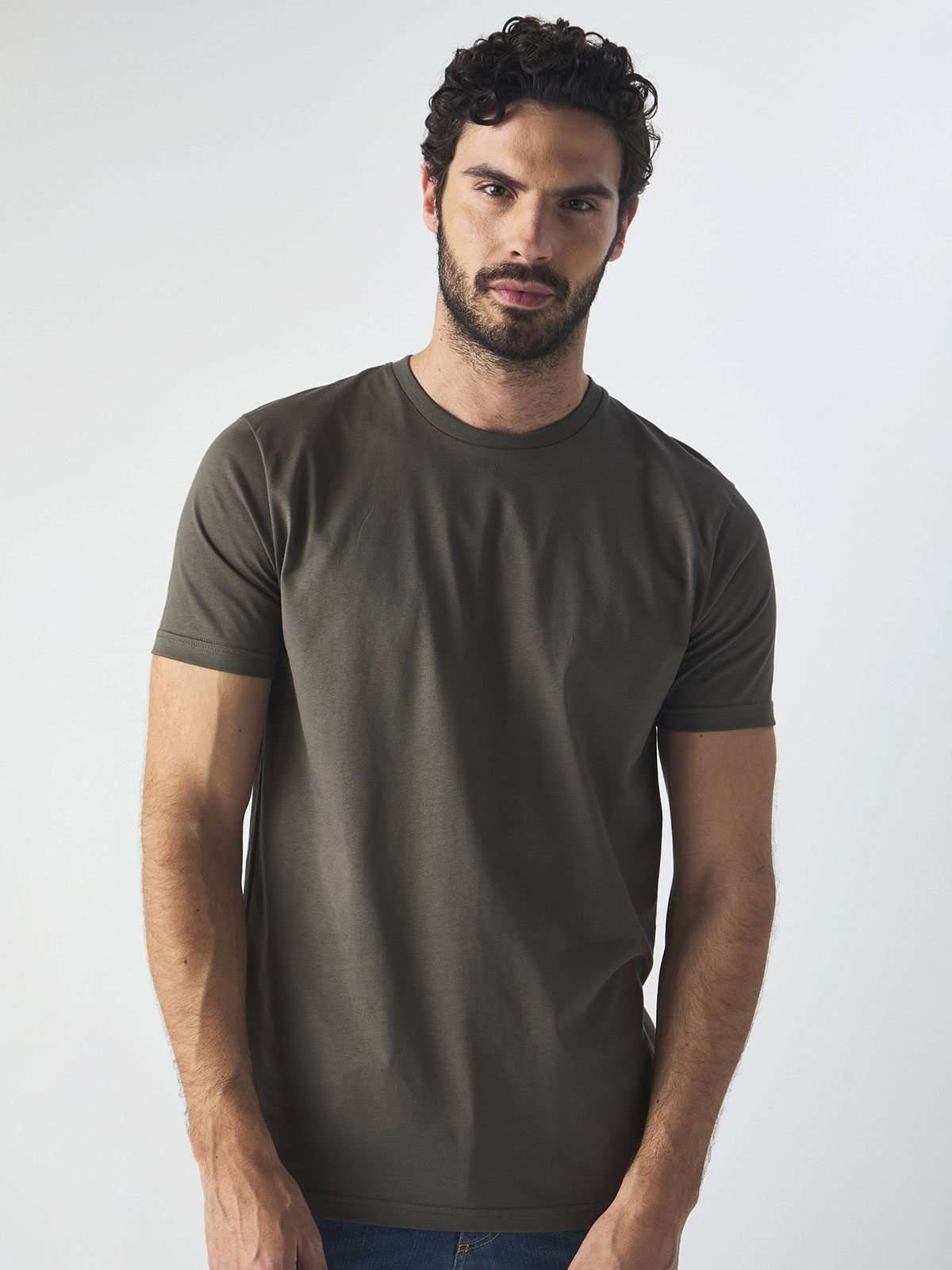 100% cotone. Girocollo basso con para sudore, manica corta, fit moderno, struttura con cuciture laterali, senza etichetta, solo una piccola etichetta taglia, etichetta composizione e made in Italy sul fianco.