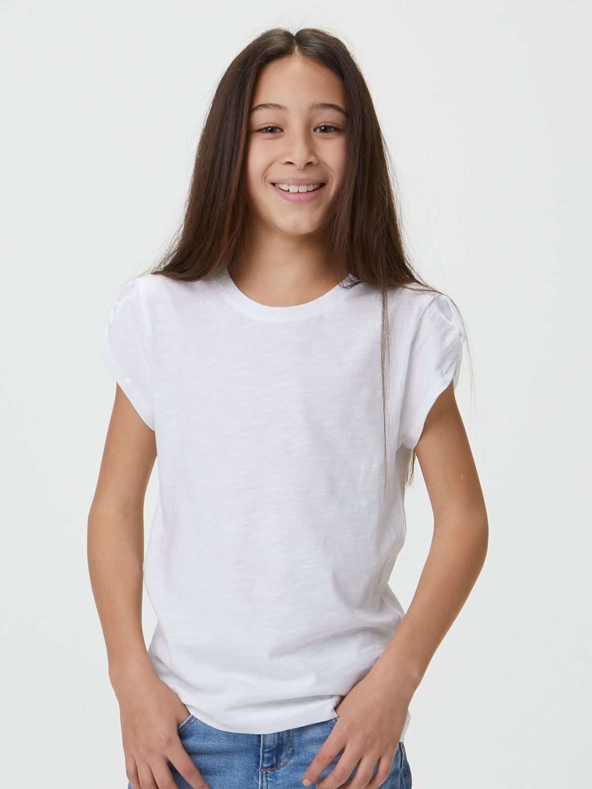 100% cotone . T-shirt maniche corte set-in, manica raccolta sulla spalla, tessuto slub, single jersey, struttura con cuciture laterali. Etichetta strappabile.