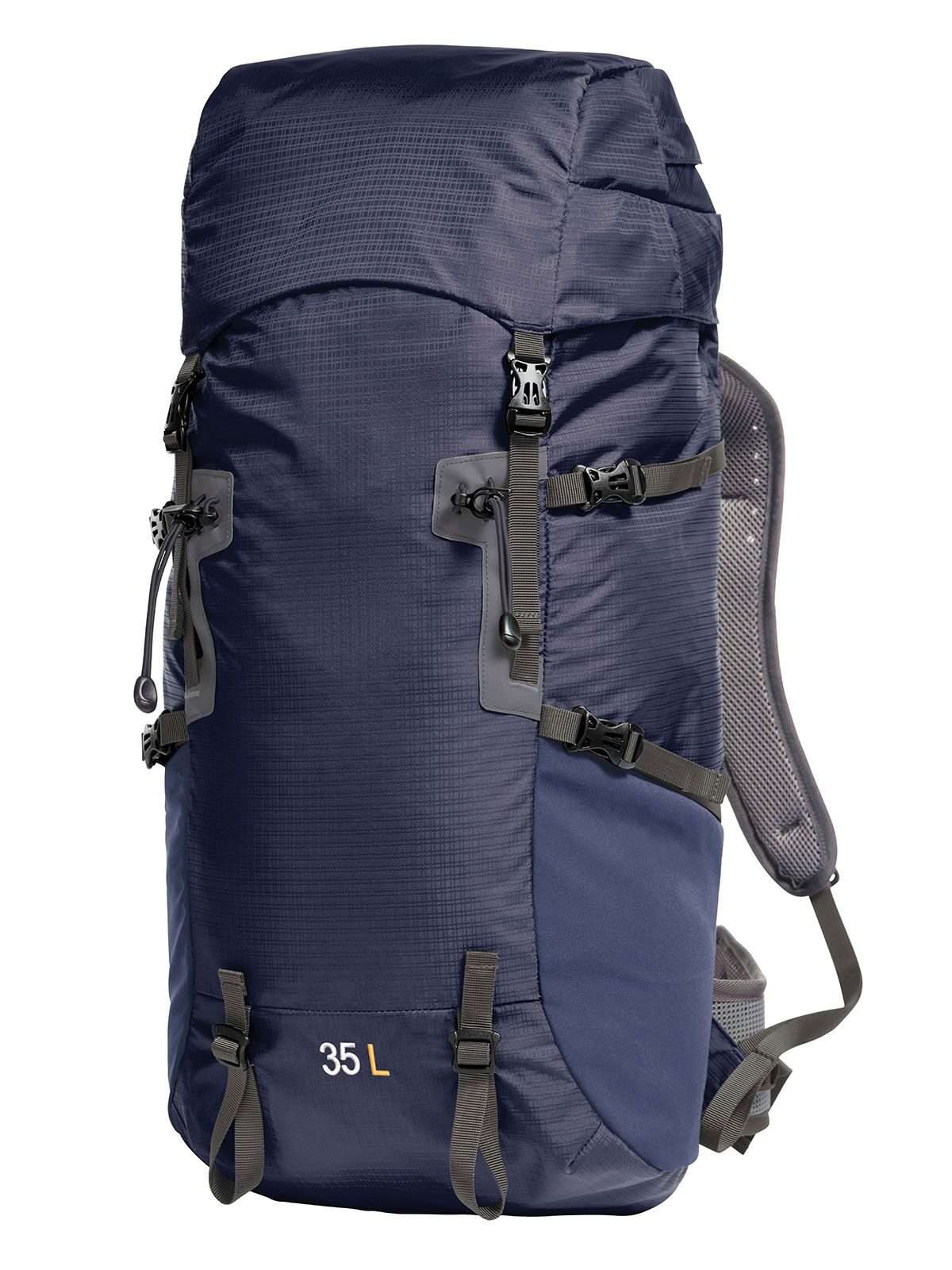 100% Nylon 210d. Zaino con sistema di bretelle regolabili, cinghia al petto regolabile in altezza, cinturino imbottito in vita. Dimensioni: 29 x 66 x 21 cm, capacita': 35 litri, area di stampa: 6.5 x 30 cm.